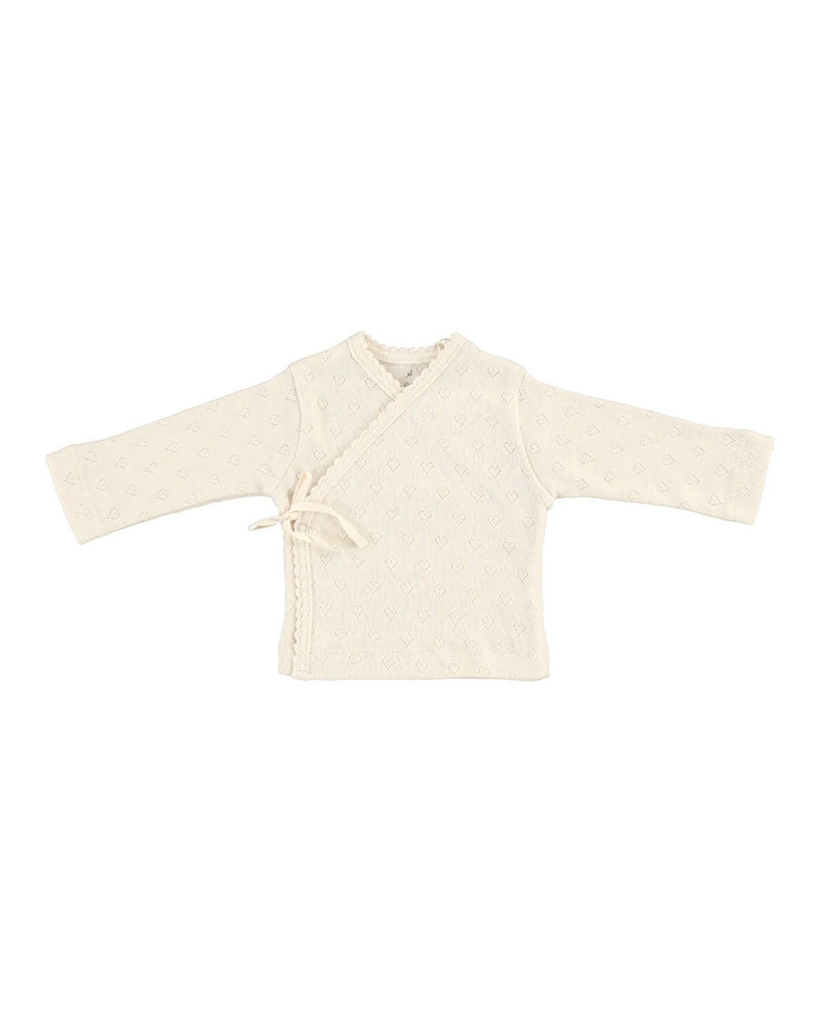 Bebe wrap tee is the ultimate item for all babies, and especially for newborns. Extremely soft tee crafted from organic cotton heart pointelle features snaps for an easy dressing, and long sleeves to give that extra comfort and coziness to the little ones. Match it with Bebe Heart footed leggings and Bebe Heart hat/Bebe bonnet for the perfect set.