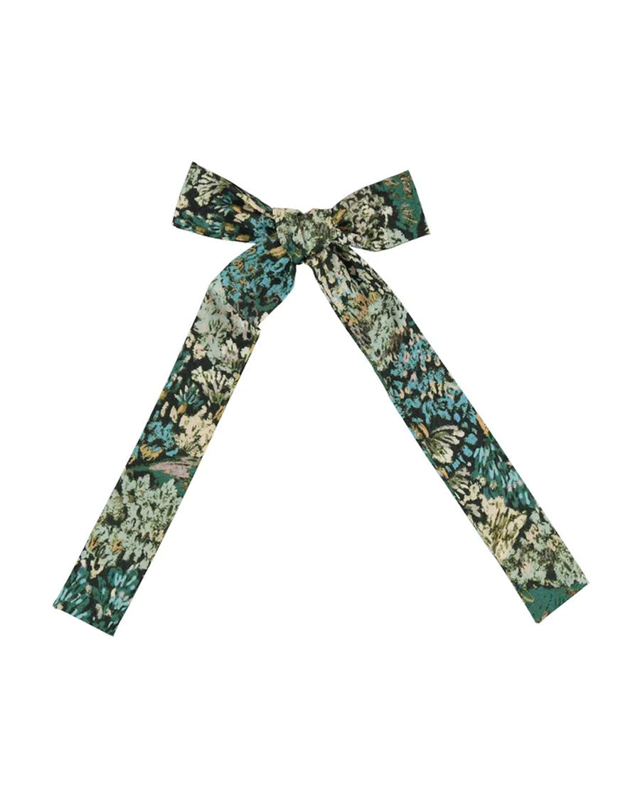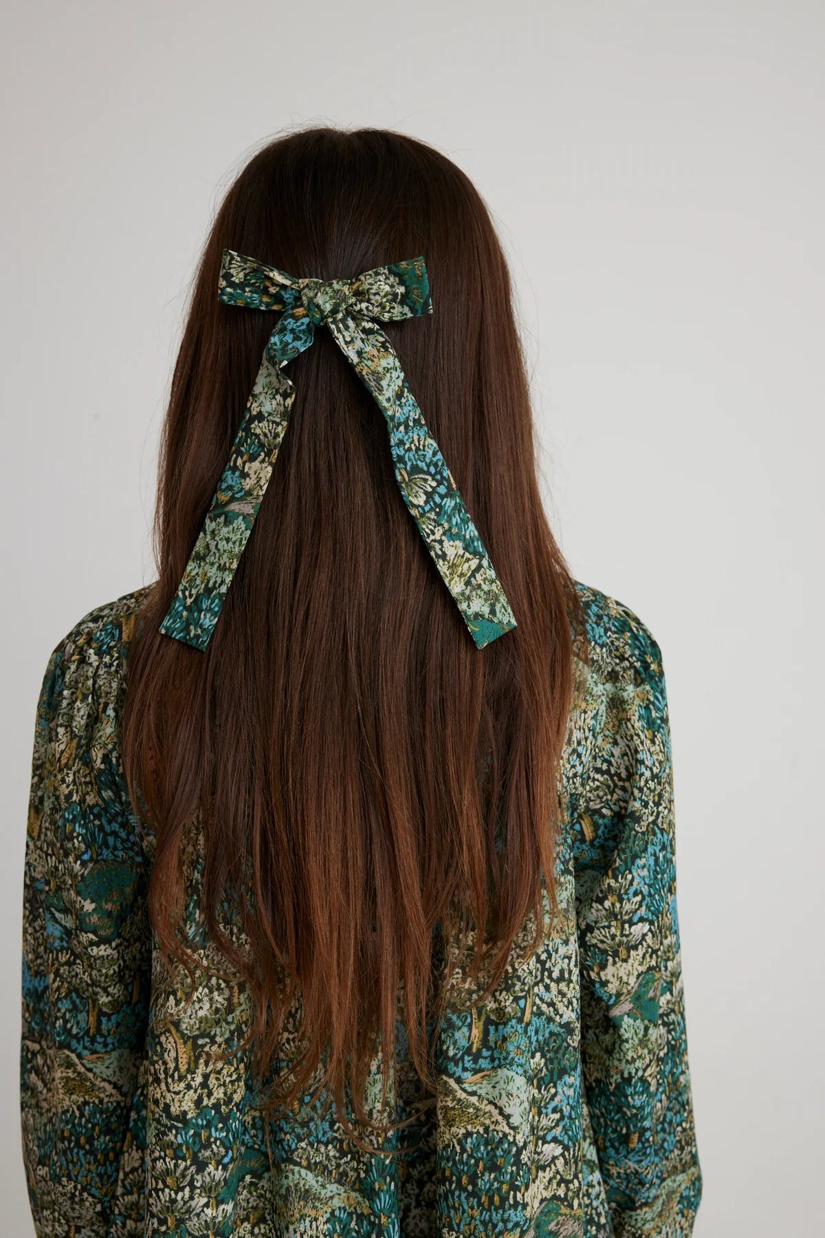 Forever inspired by a romantic dream forest. Sweet hand-tied Nola big bow is crafted from soft cotton in adorable dream forest print with green, blue, and mustard yellow tones. The bow is attached to an alligator clip. A perfect match with the Nola dress.