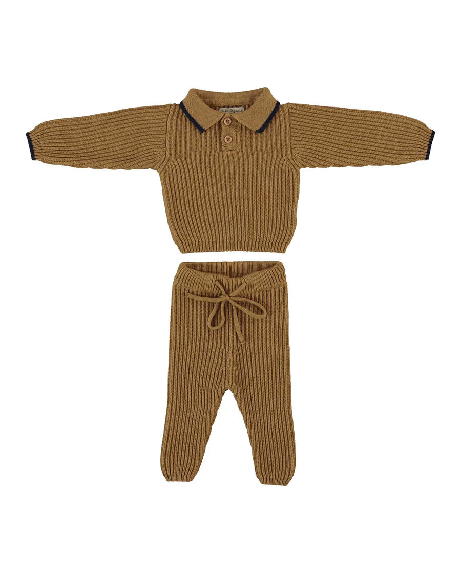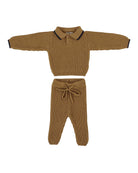 Vintage-inspired Oscar set in cotton-wool knit in brown color with navy blue stripe detailing. The versatile baby set features a polo shirt with long sleeves, a classical collar, rib front opening with wooden buttons, ribbed cuffs, and hem. The set comes with a matching pair of leggings with an adjustable elasticated waistline. Easy and comfortable style for chilly fall days.