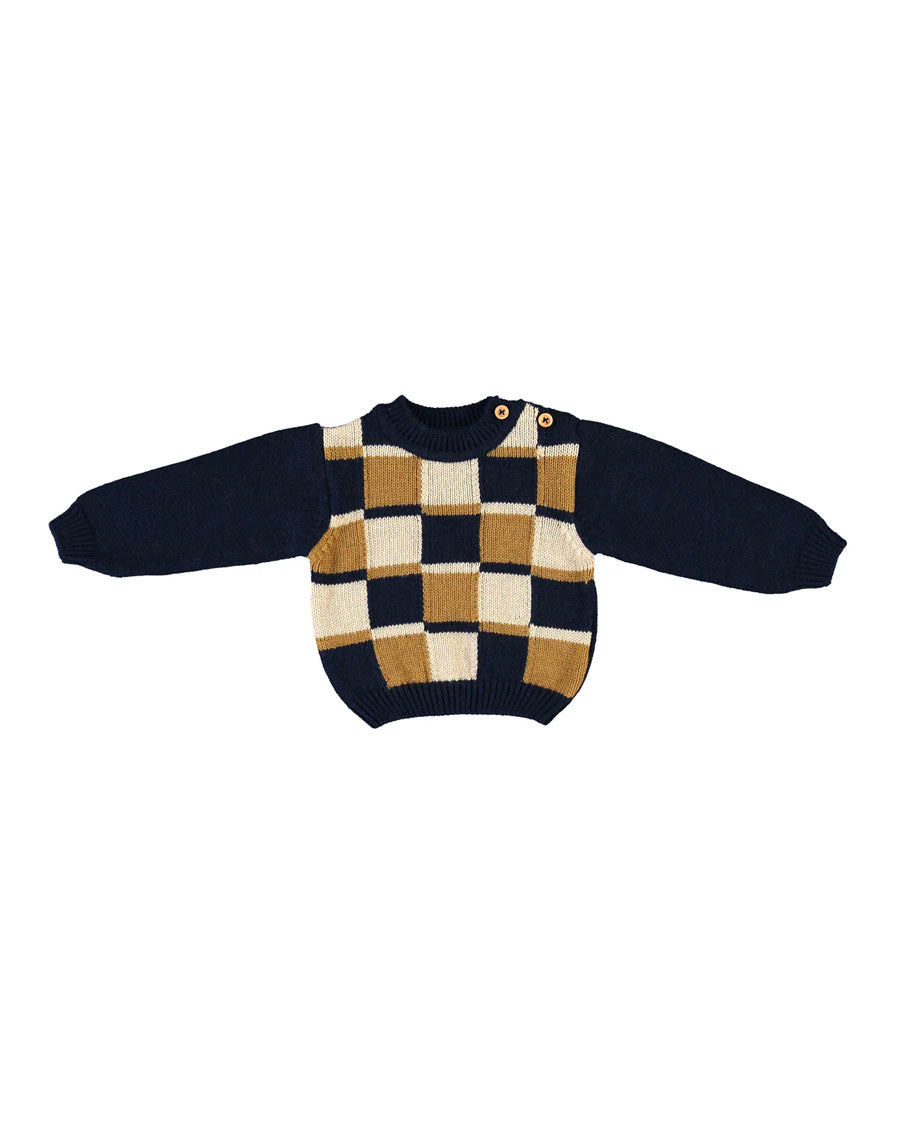 Vintage-inspired Silas baby sweater is knitted from the softest cotton-wool blend yarn featuring a beautiful colour palette with navy blue and caramel tones. Baby sweater has a round collar, geometrical pattern, shoulder opening with wooden buttons.