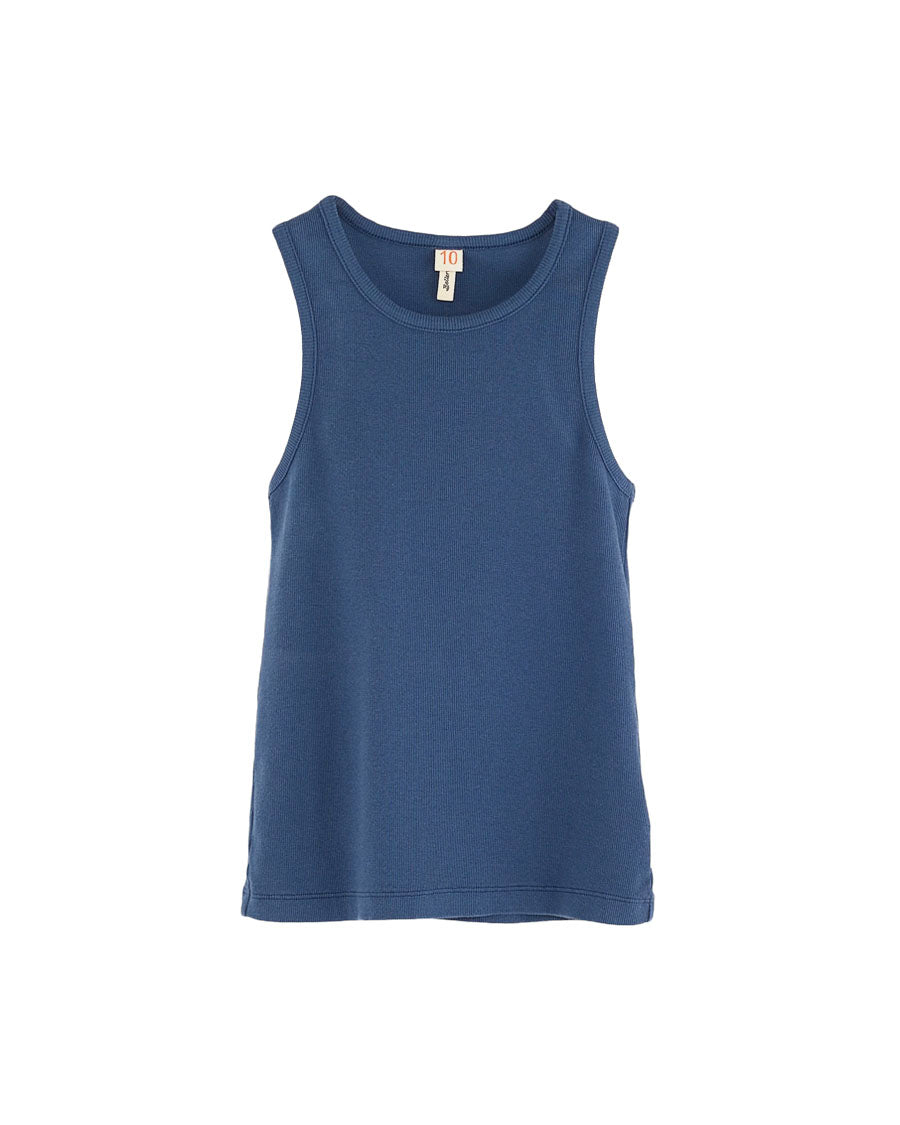 Slim fit racer-back tank-top made from ribbed cotton jersey in denim blue.