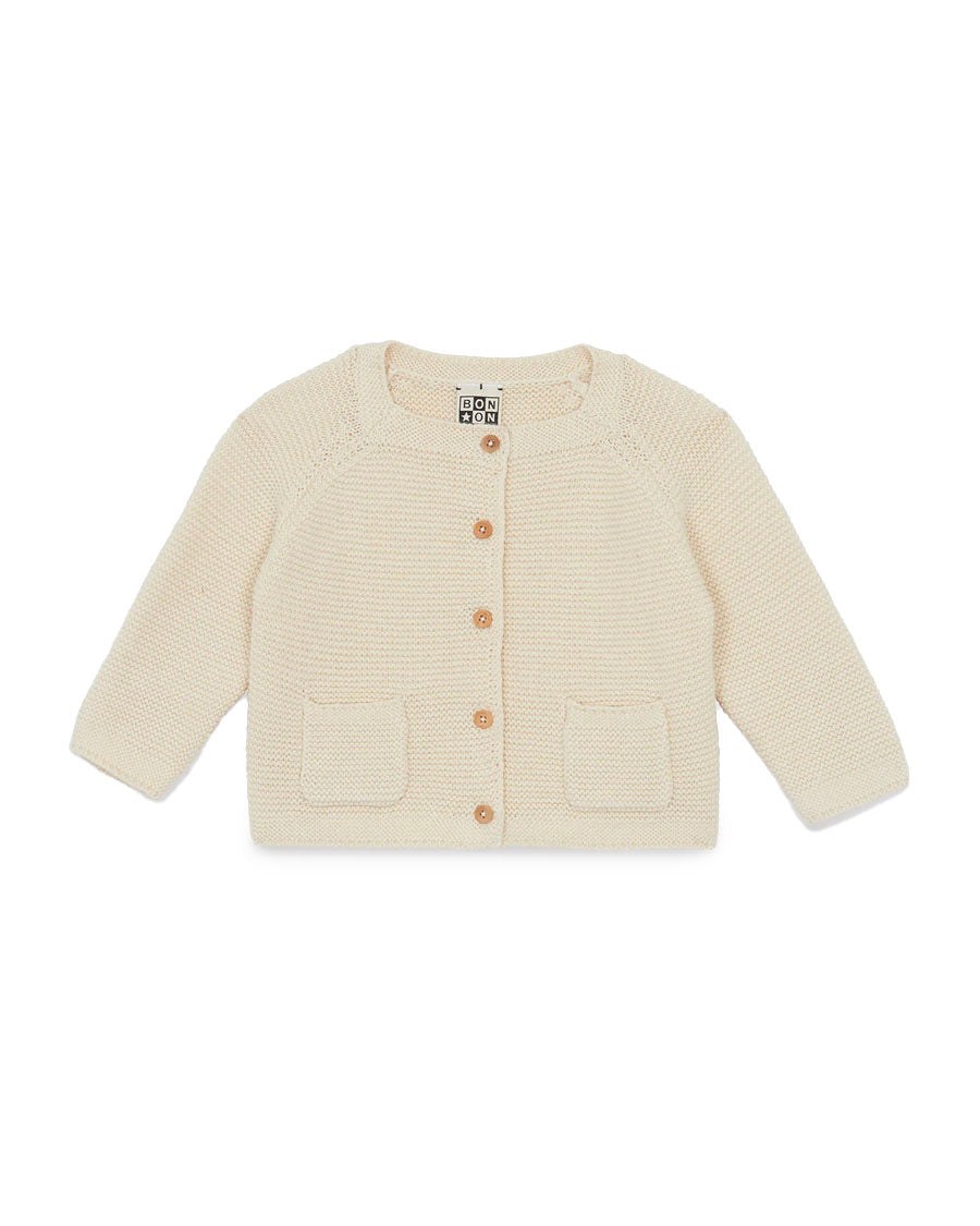 THE Cardigan Lady de Bonton in "Panna Cotta" shade, is an essential elegant for toddlers. Made of fine knitting, with Button in Wood And its small pockets it combines comfort and timeless style. Ideal for completing all the outfits of Baby