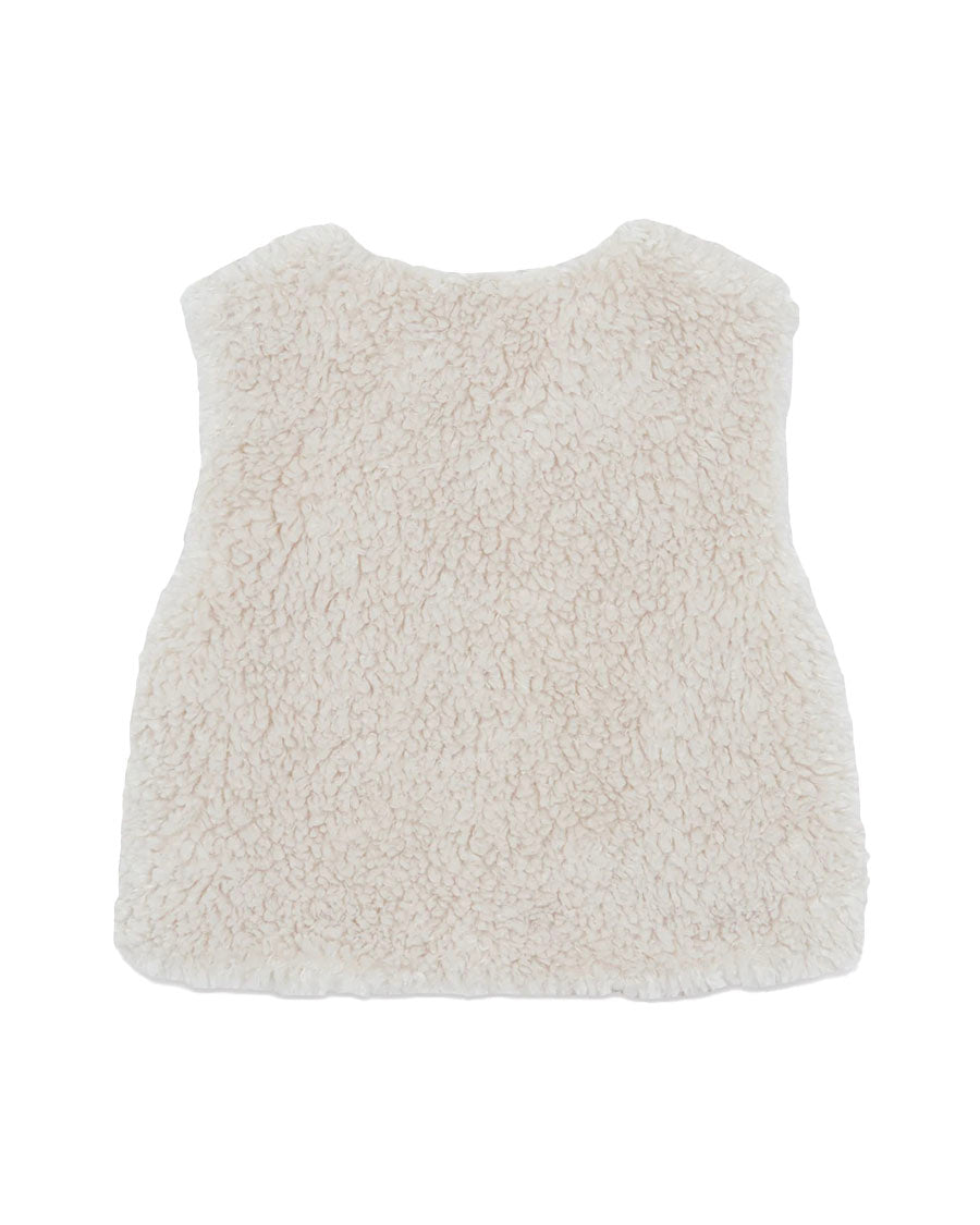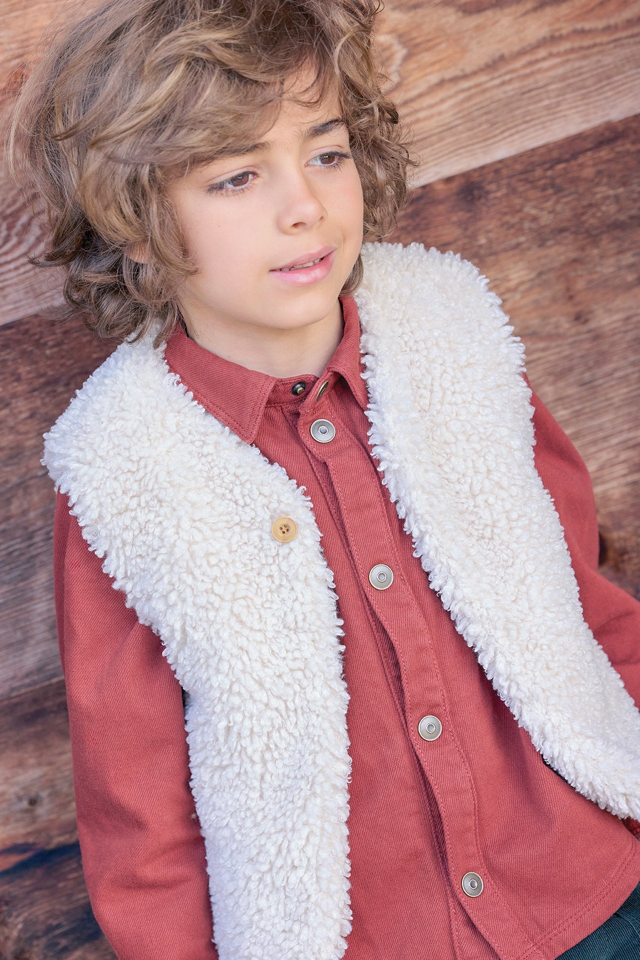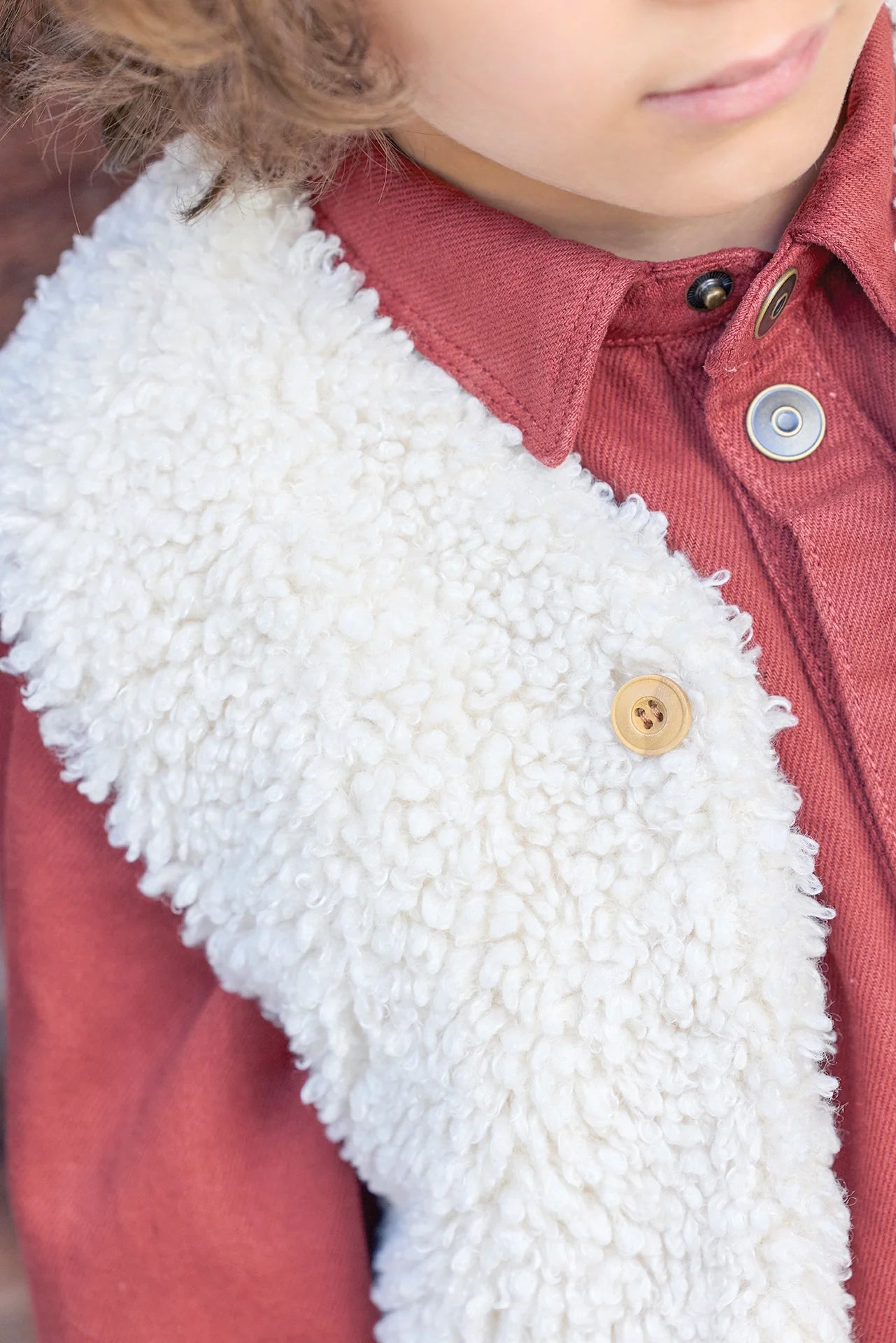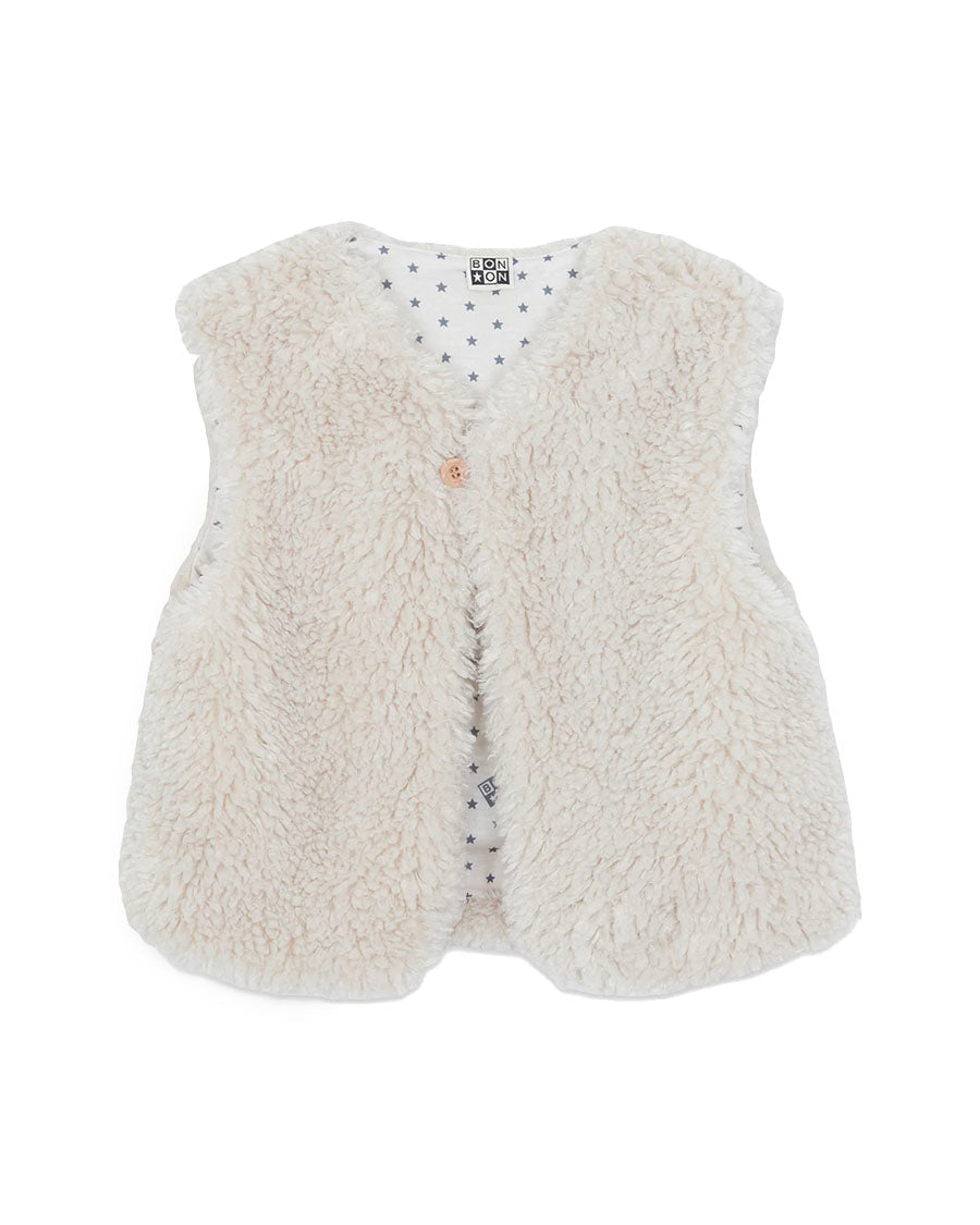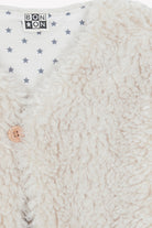 THE Cardigan Beti, iconic of the "Faroe Island" collection, evokes a sweet adventure with its imitation Mouton fur material in Ecru Bonton. Perfect for small explorers, it is coupled with a Print Star that invites you to dream. This Cardigan Sandless, with its engraved button and adjusted cut, brings a touch of Nordic and warm style. Ideal to carry on a Sweater or a Shirt For winter getaways with class!