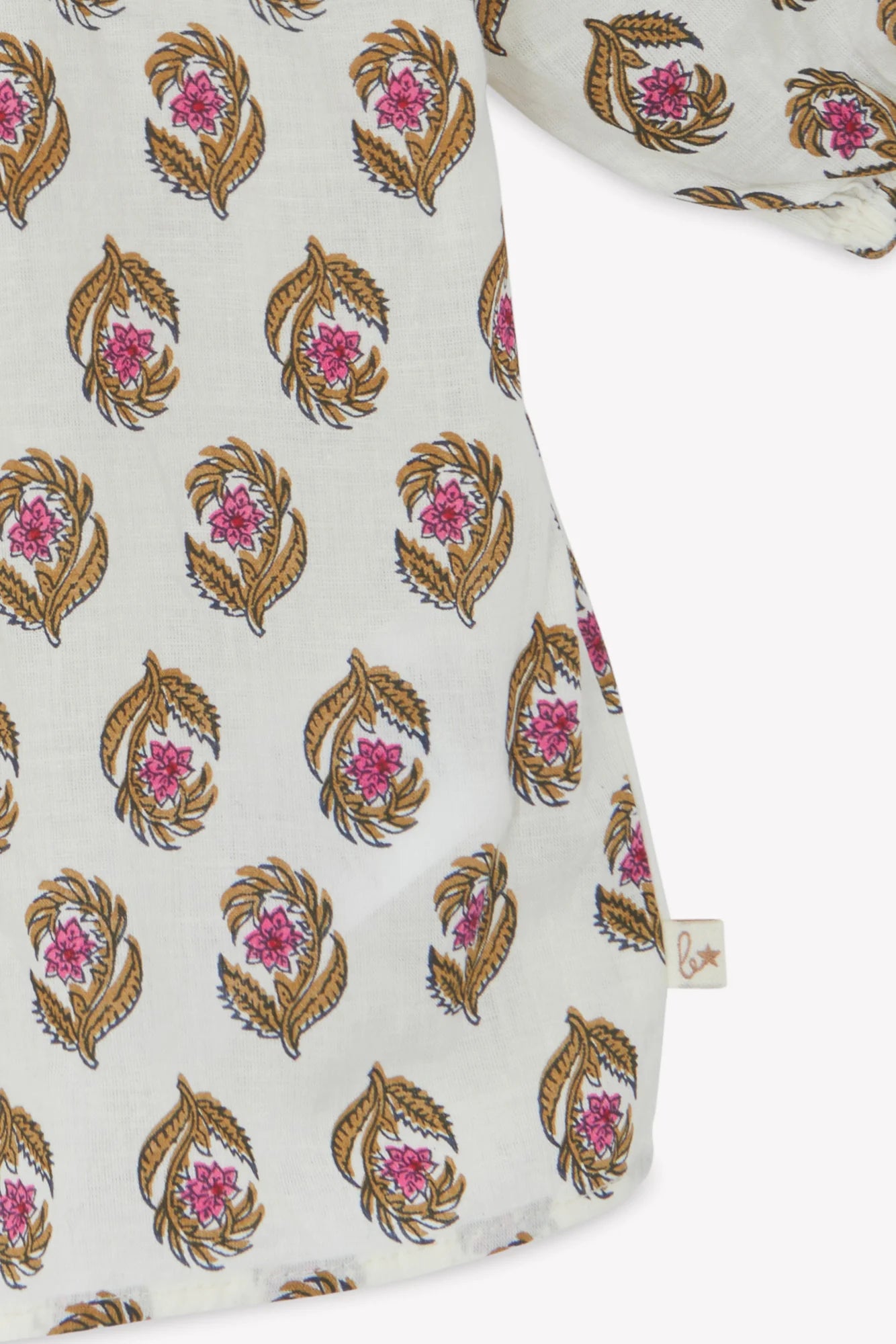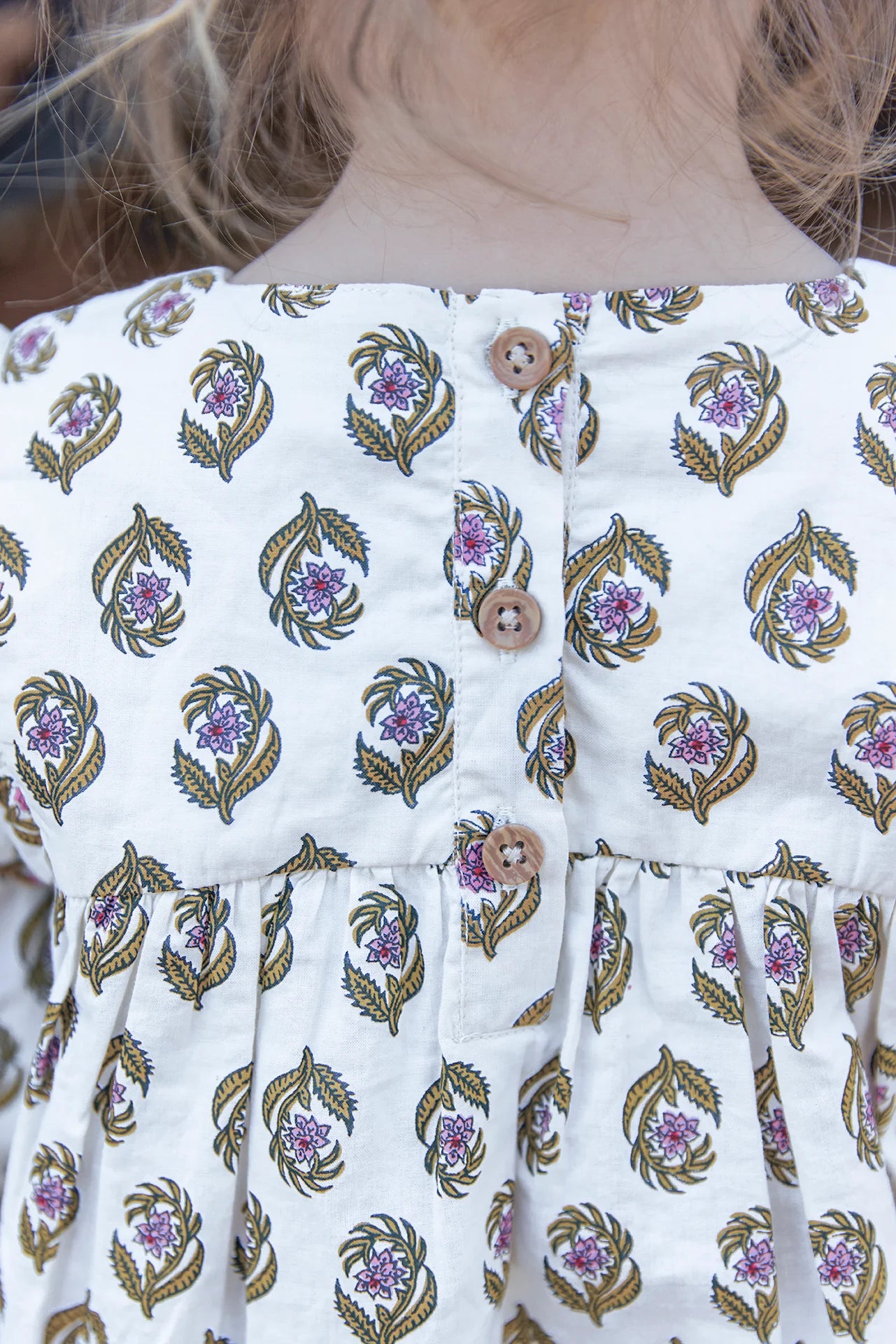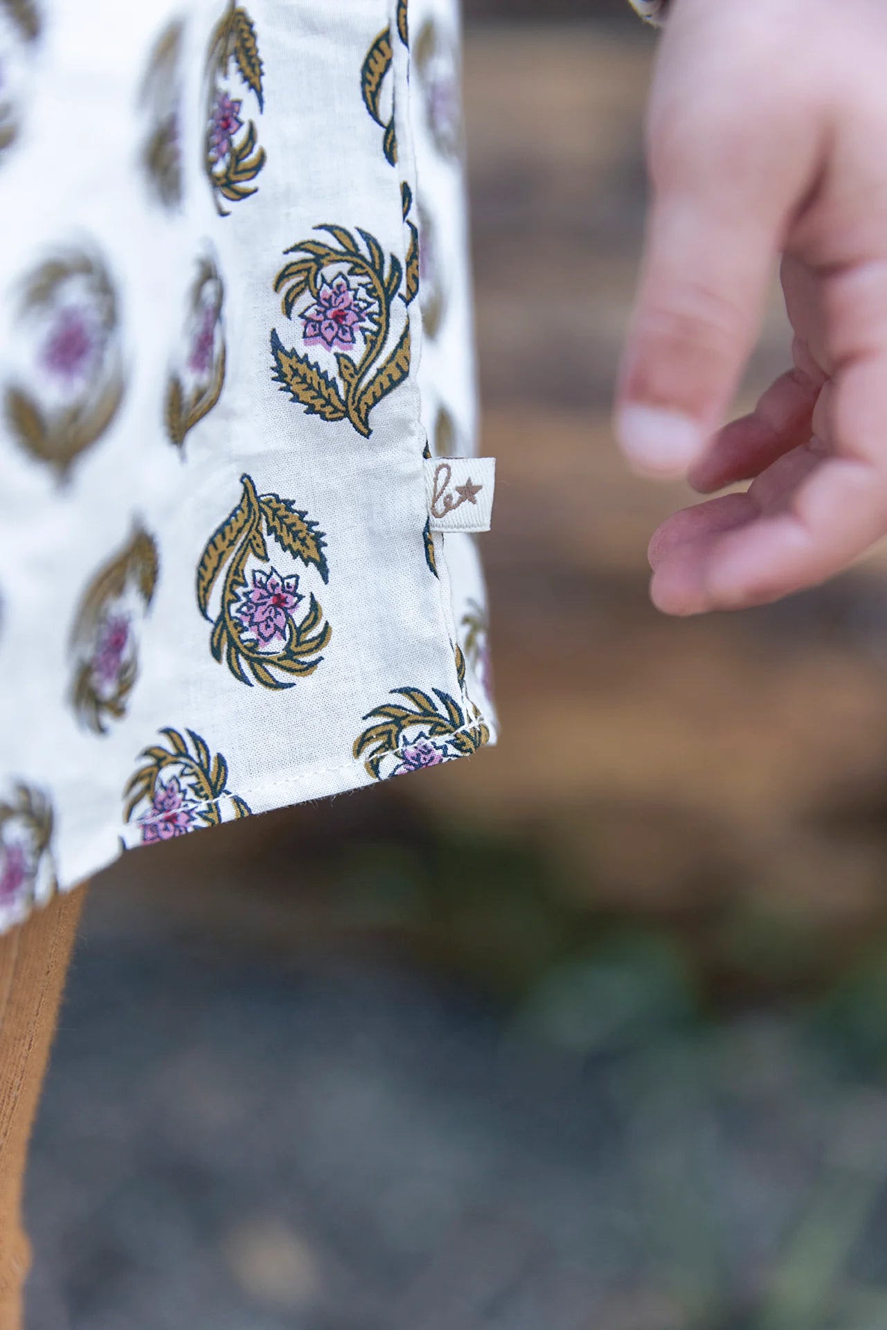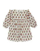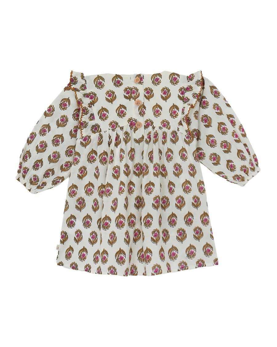 With the Dress Mirtle with Flowers Blockprint patterns, your little cowgirl is ready for an adventure in the great west! His Puffy sleeves And Ruffles To the armhole add a touch of fantasy. Made of 100% cotton, it is perfect for sunny days. A must-have from the "New Barn" collection, to associate with boots for an adorable western look.