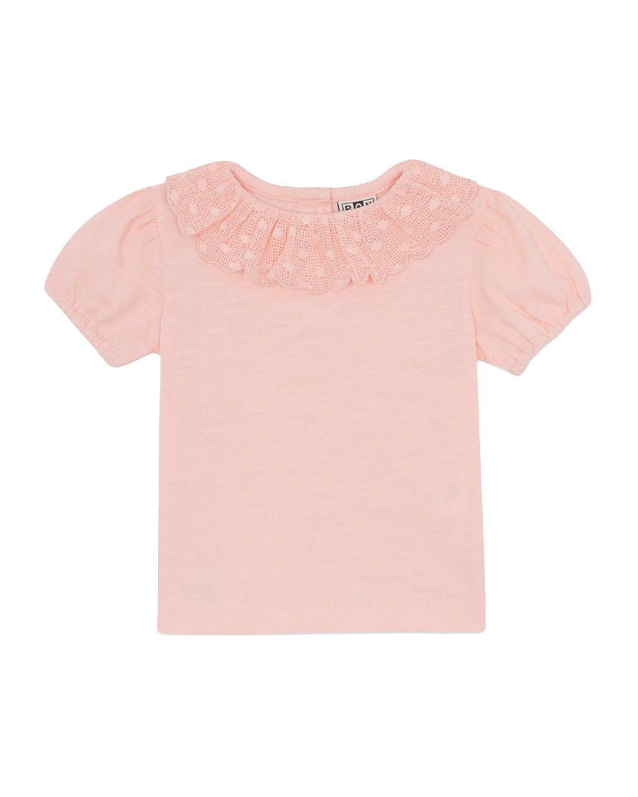 The Niris t-shirt in Pink sunset is a concentrate of joy! With his Collar in Lace and his Puffy sleeves, it invites you to adventures full of style. Perfect for a playful look, it can be worn with a Short in jeans or Skirt light. Its buttoned opening at the back adds a touch of practicality. From the "Viva la Vida" collection, it's a must-have for a sunny summer!