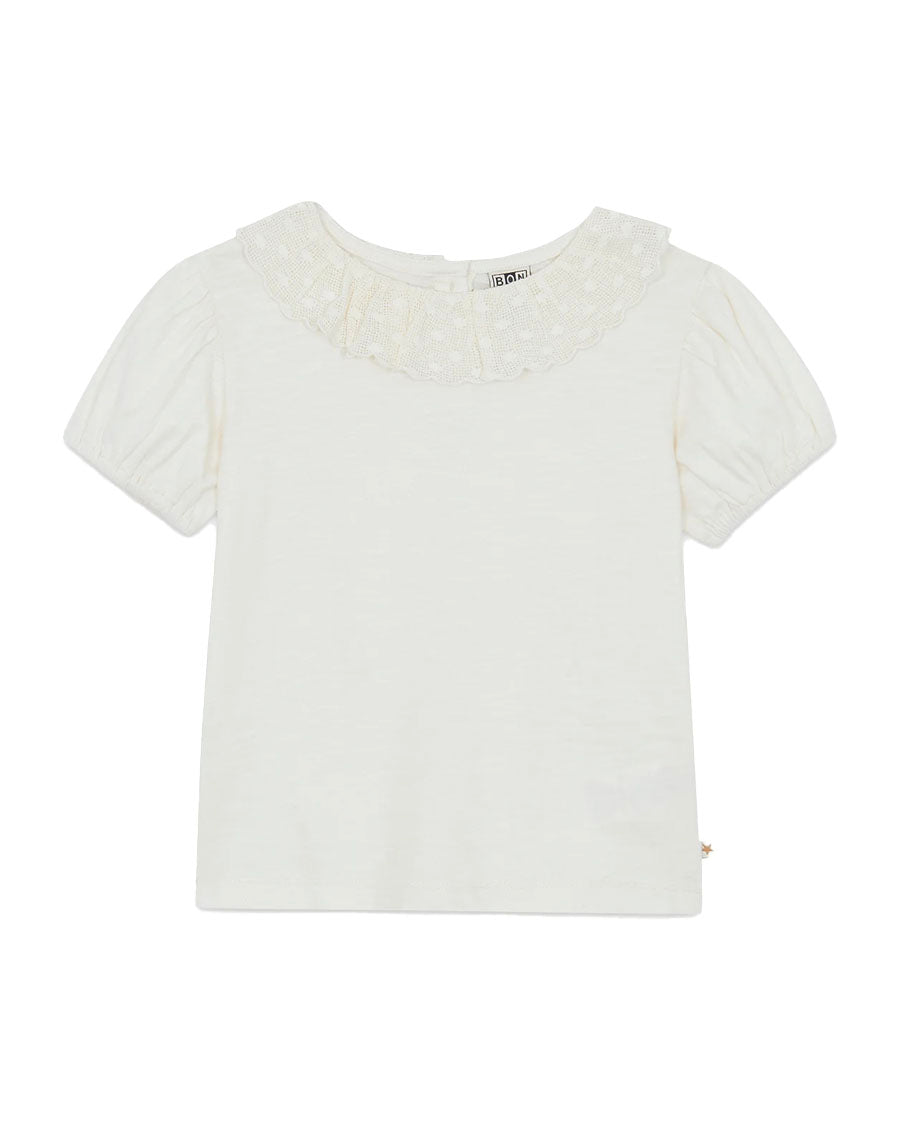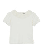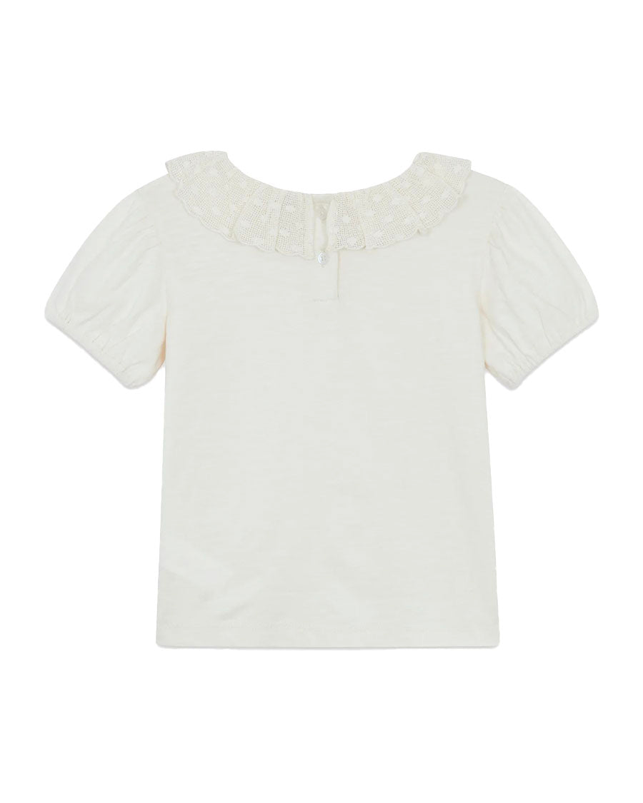 With his Ruffled collar in Lace and his Puffy sleeves, This Niris ecru Bonton t-shirt is a real summer party! Ideal for sunny days, it combines softness and style thanks to its 100% comfortable cotton. Easy to put on with its two-way closure Button, it goes perfectly with a Short or a Skirt for a fresh and sparkling look all summer season.