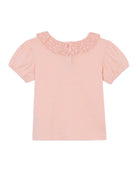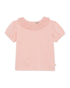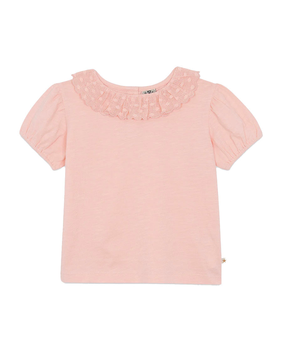 Let yourself be seduced by the Niris t-shirt Pink sunset, a burst of fantasy in the “Viva la vida” collection! With his Ruffled collar in Lace and his Puffy sleeves, this t-shirt is an ode to the joy of living. Made from soft cotton, it's perfect for adventurous summer days. Combine it with a Skirt light or jeans for a fresh and playful look!