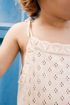 The Jumpsuit in Knitwearfine nuevo ecru Bonton is a jewel of tenderness! With his Braces to tie and its handmade crochet finish, it wraps Baby of gentleness. Perfect for a summer day, it ensures comfort and style thanks to its Button at the crotch. Pair with a little hat and sandals for a retro and charming look, ideal for sunny outings!