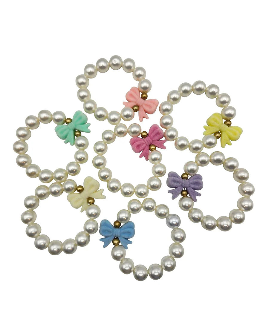 Classic and timeless, our new bow bracelets feature a sweet flocky bow focal bead and quality 12mm creamy acrylic pearl beads with two 6mm matte gold beads for trim. We designed these to coordinate with our new pearl unicorn bracelets so they can be stacked in assorted colors. Bracelets come in 7 sweet pastel colors--berry pink, peach, lemon yellow, cream, mint green, cornflower blue and lavender--and are appropriate for Easter, Passover, communion, recitals or any other formal occasion!!