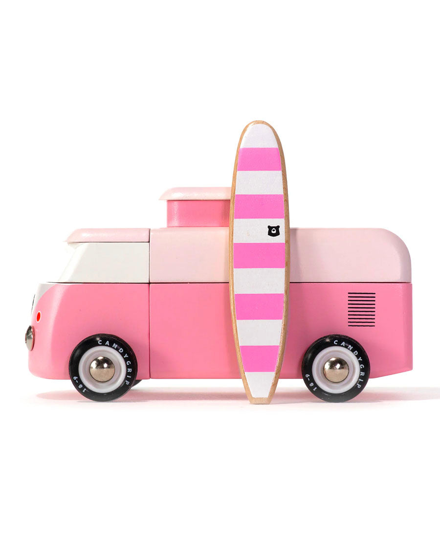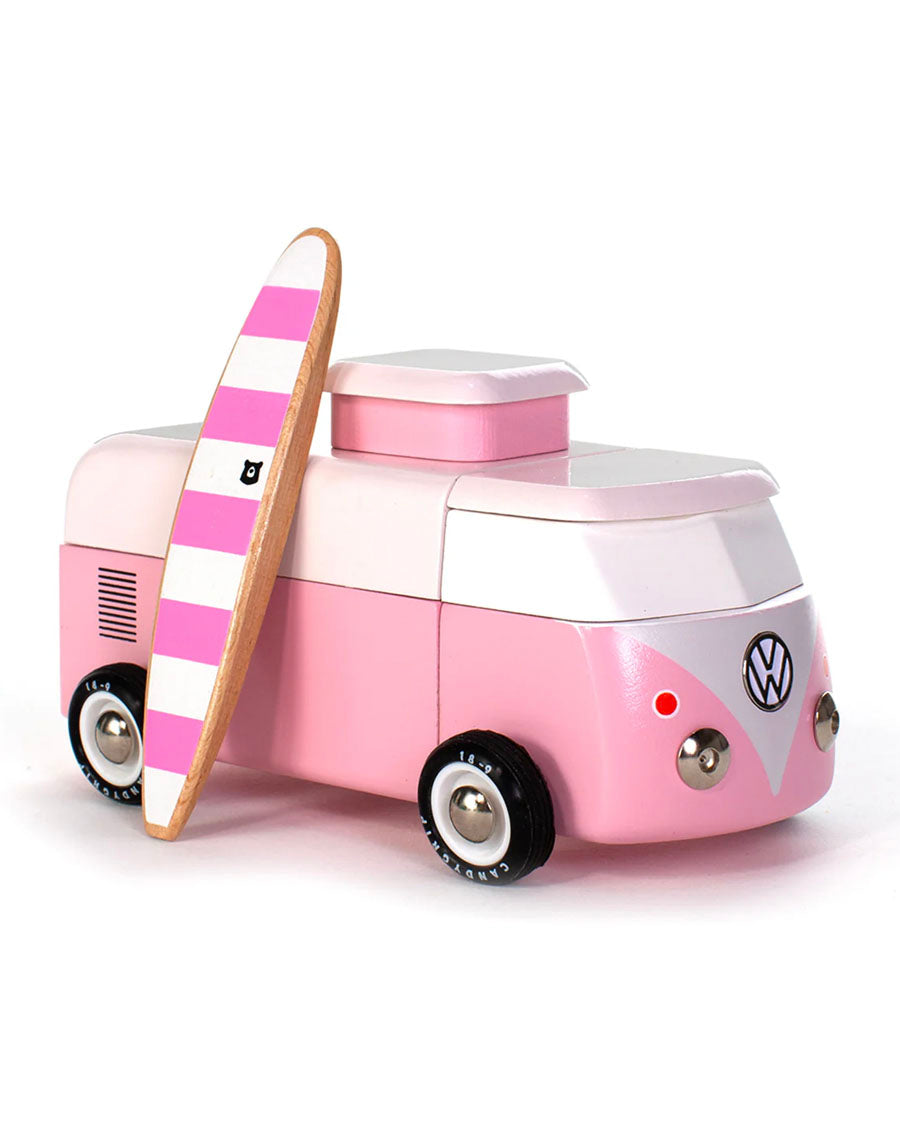 The Beach Bus is back! Now officially licensed by VW - check out the shiny emblem on the front. This iconic Volkswagen Type 2 comes with a magnetic camper top and surf board.