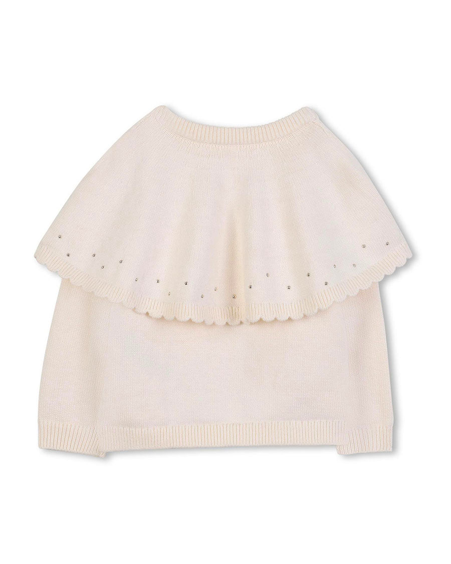 This Chloé Kids cardigan, made from a wool and organic cotton knit blend, features a cape-style flounce with a scalloped edge and studs, perfectly reflecting the Maisons identity. The front is adorned with gold-tone engraved Chloé buttons, while a gold-tone Chloé logo plaque accents the hem. Ribbed trims complete the piece.