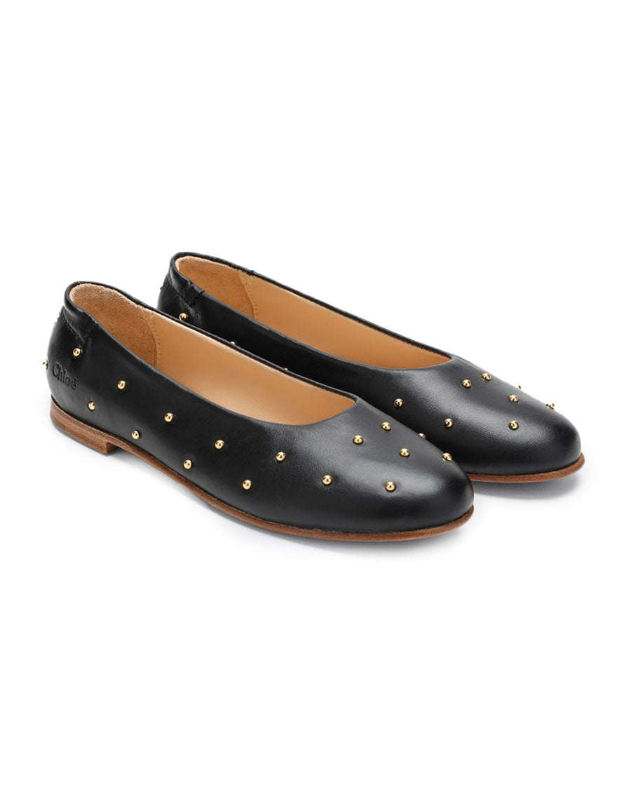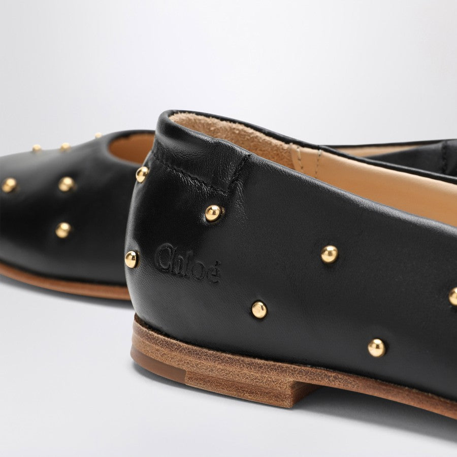 Chloé ballerinas in black leather, featuring a round toe, small golden studs all over, embossed logo lettering on the side, and a leather sole.