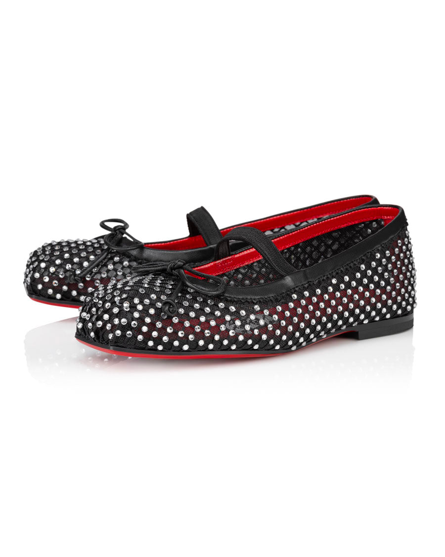 Crafted from black fishnet embellished with hand-applied strass, the Baballet Strass ballerina is distinguished by its suppleness. This Maison Christian Louboutin model showcases a small bow and square toe, inspired by traditional ballet shoes. This model features a new 'Everlasting Red Sole' thanks to an innovative coating technique that ensures resistance and lasting vibrancy for our signature Louboutin red.