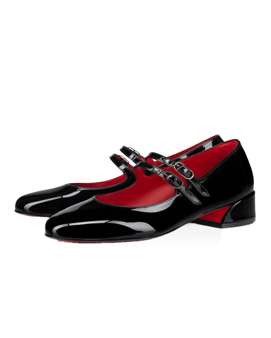 The Jane Fille sandal features a square, angled 30 mm heel. This Maison Christian Louboutin model showcases a rounded toe and all-over black patent calf leather. Loubi red interior.