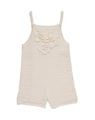 A cotton crochet romper with adjustable straps and handmade flower appliqués.