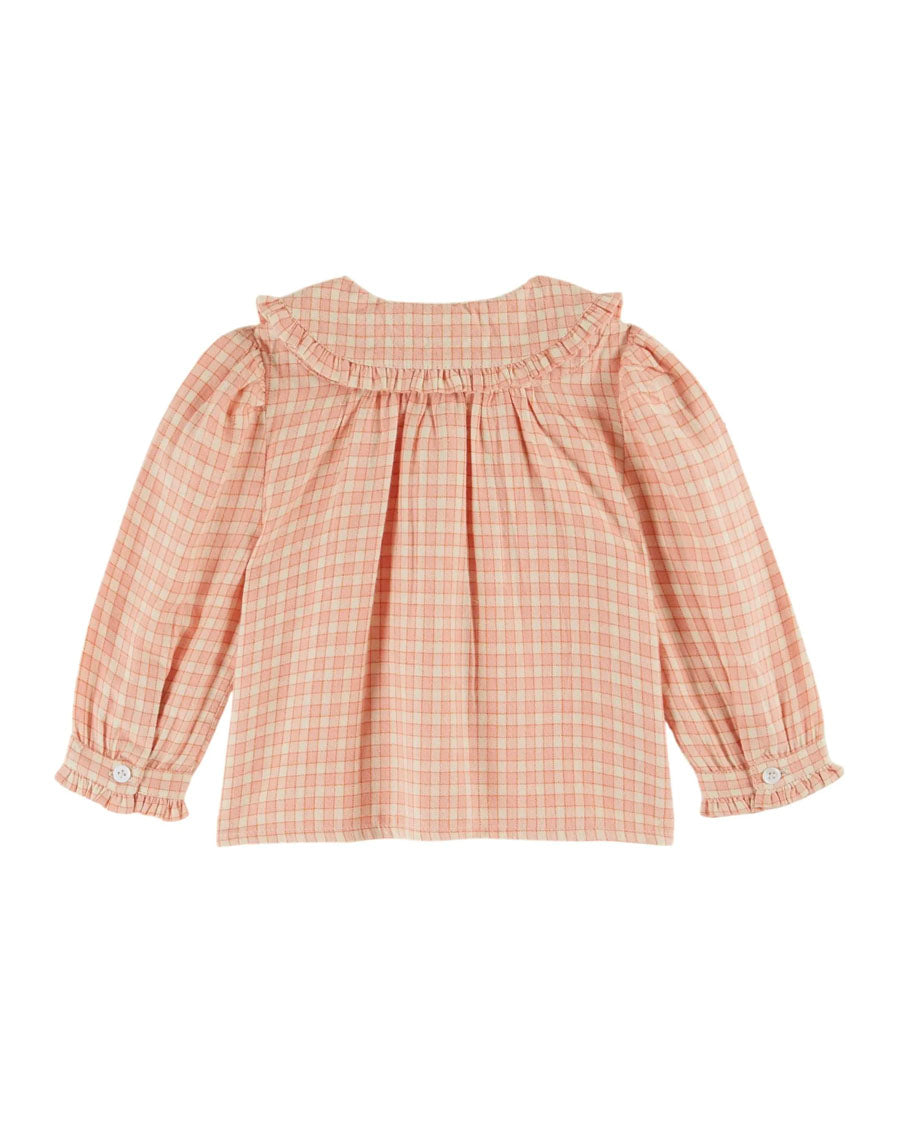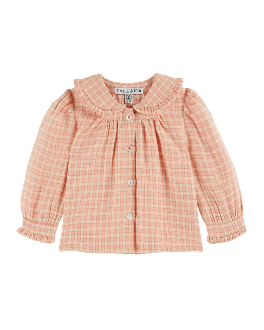 A cotton blouse with pink and white checks surrounded by fine orange lines. A blouse made from thick but supple cotton, so your girls can spend happy days wrapped in softness and comfort.
