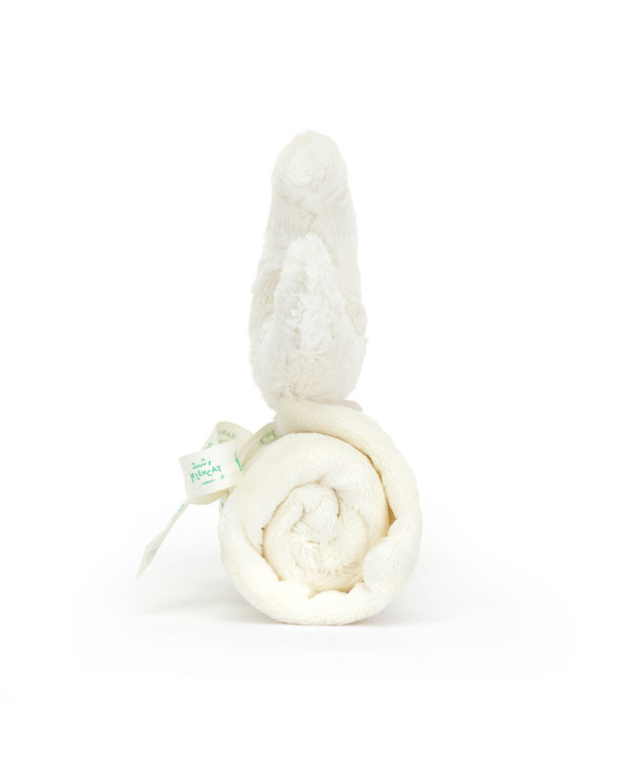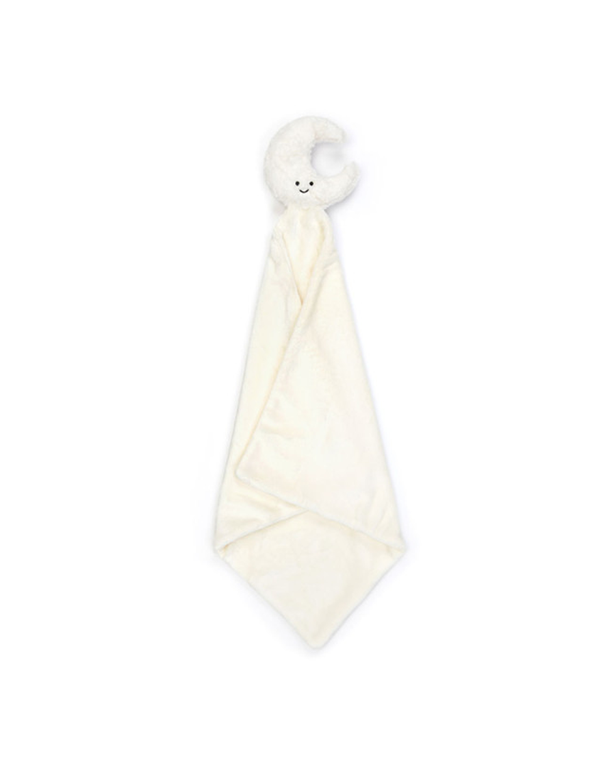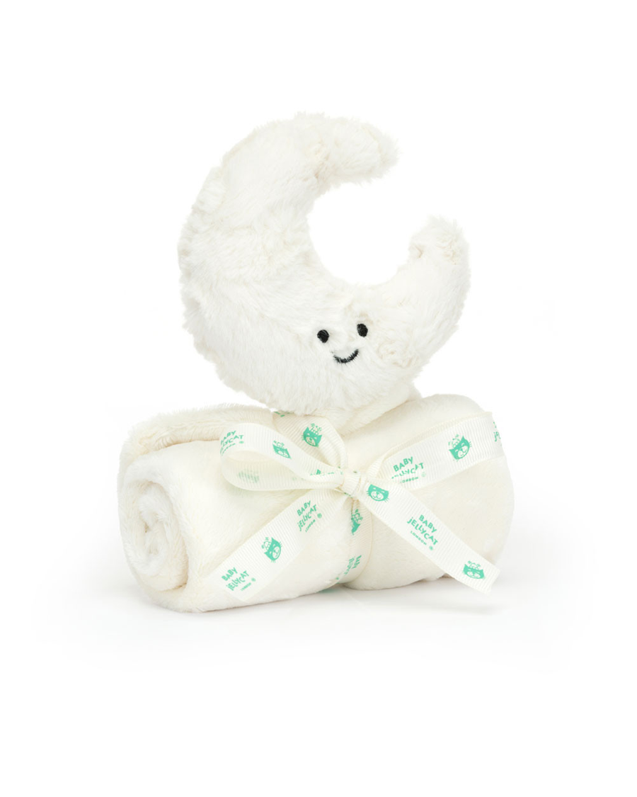 The Amuseables Moon Soother is beautifully textured in cream fur with embroidered eyes and cheerful smile. The crescent moon holds an irresistibly soft soother, made with recycled fibres. Rolled up and presented in a Baby Jellycat grosgrain ribbon, it makes a gorgeous gift for newborns, sure to bring smiles and cuddles.
