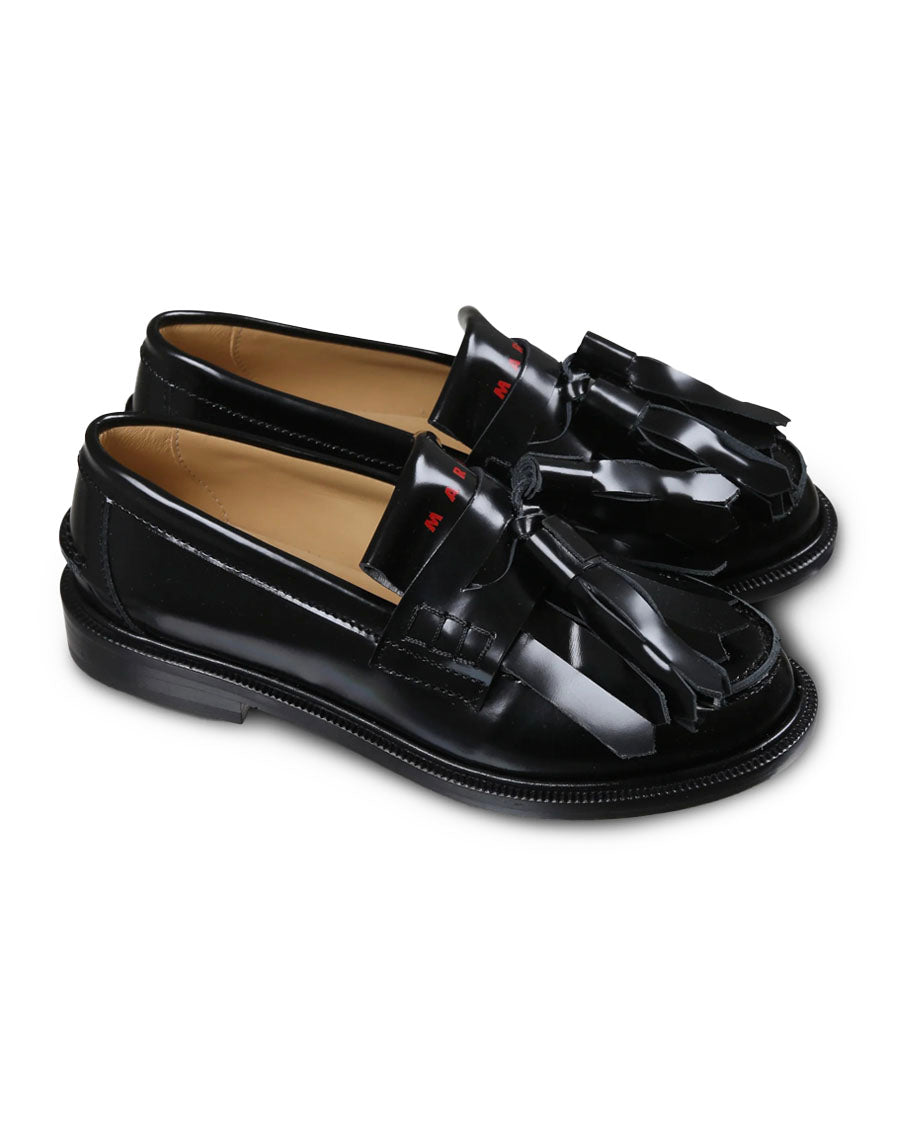 Black leather loafers with rubber sole, tassels and fringes on the upper. They are embellished with a logo on the front. Made in Italy.