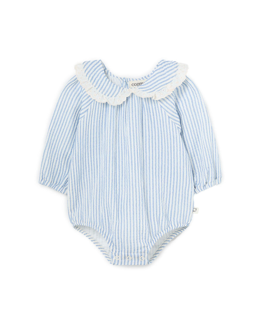 Dress your little sunshine in the sweetest comfort with our Striped Baby Girl Romper! Made from soft, light cotton gauze, this charming piece features a playful bubble silhouette that adds just the right amount of volume for twirls and giggles. The round neckline is adorned with an adorable Peter Pan collar, complete with ruffles and eyelet details—perfect for those picture-perfect moments. With long sleeves to keep her cozy and elasticized leg openings for easy diaper changes, getting her ready has never been simpler! Snap buttons at the gusset and buttons at the back make dressing a breeze. Plus, say goodbye to ironing woes; our non-iron fabric means more time for cuddles! Available in sizes ranging from tiny infants to delightful toddlers, this romper is part of Cozmo's baby gauze clothes collection—a blend of style and ease every mom will love. Because when she looks cute, you feel amazing too!