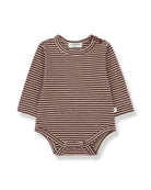 Striped long-sleeve baby onesie with mini Peter Pan collar.