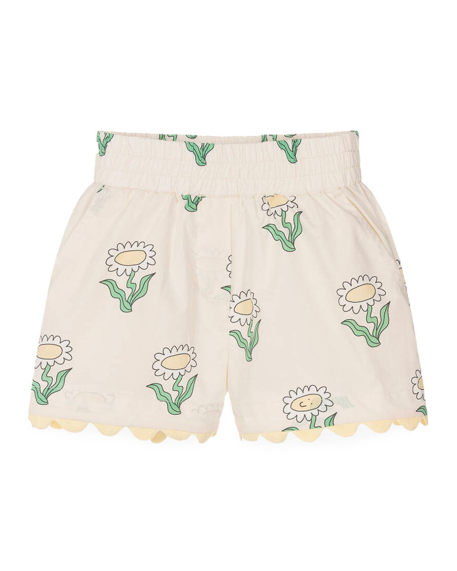 Daisies shorts for girls by Stella McCartney Kids, made in soft, smooth organic cotton poplin. These fun shorts have a pretty daisy print and yellow scalloped edging on the legs. They have slanted front pockets, patch pockets on the back and an elasticated waist for a comfortable fit.