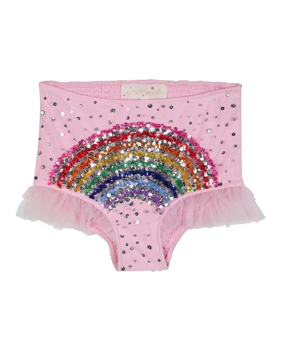 Dive into a burst of rainbow magic with our Rainbow Dream Shorts, where every detail is a playful celebration of color and sparkle! These shorts are adorned a hand-sequined rainbow that shimmers like a treasure trove of candy-coated dreams, surrounded by a sprinkle of extra sequins for an added pop of pizzazz. A shirred section at the back brings and extra special movement to this fashionable piece while the sides are trimmed with tulle frill ruffles, making these shorts as fun as they are fashionable.