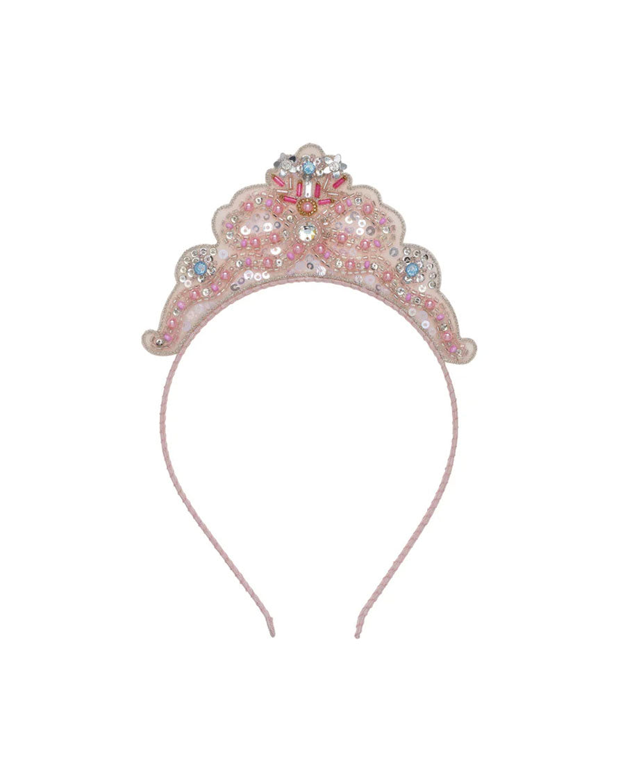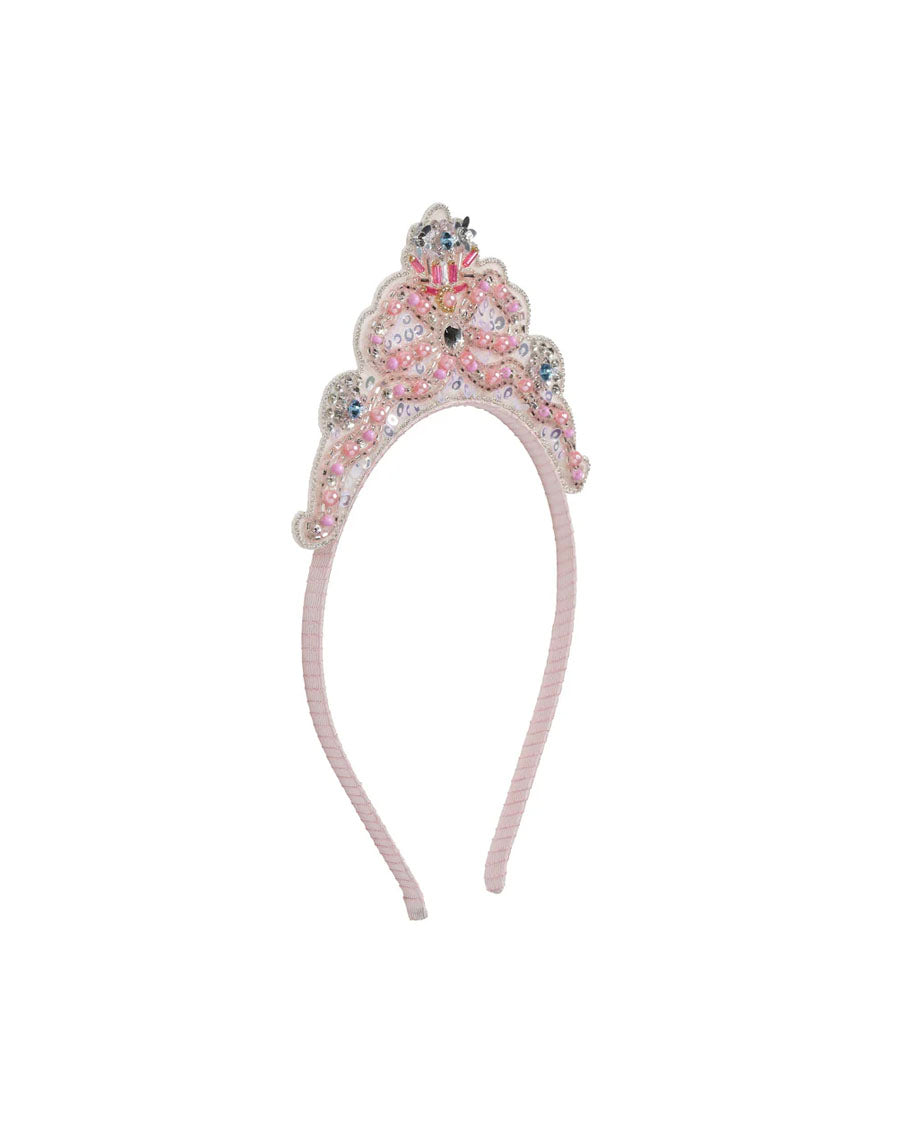 The enchanting Fonteyn Tiara in Heavenly Pink is a truly exquisite masterpiece that radiates elegance and timeless beauty. Beautifully decorated with sequins and shimmering beads to form a bow motif, this one-of-a-kind tiara is carefully created from a ribbon-encased band.