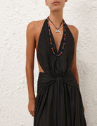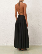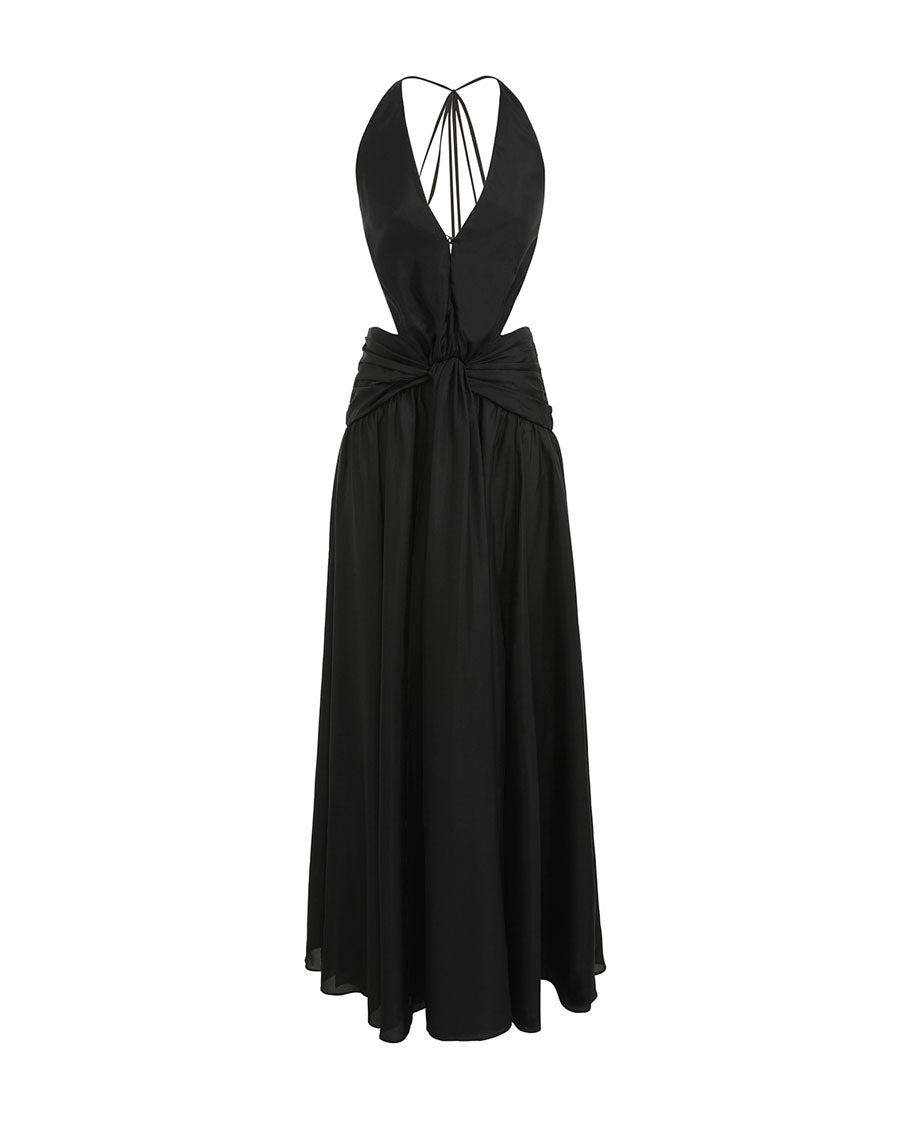 The Rhiannon Plunge Halter Maxi in Black from our Summer Swim 2025 Collection. A silk habutae halter neck maxi dress featuring a dramatic plunging V-neckline, fitted at the waist with exposed sides, an open back with self tie beaded drawstrings, finished with flared skirt detailing.