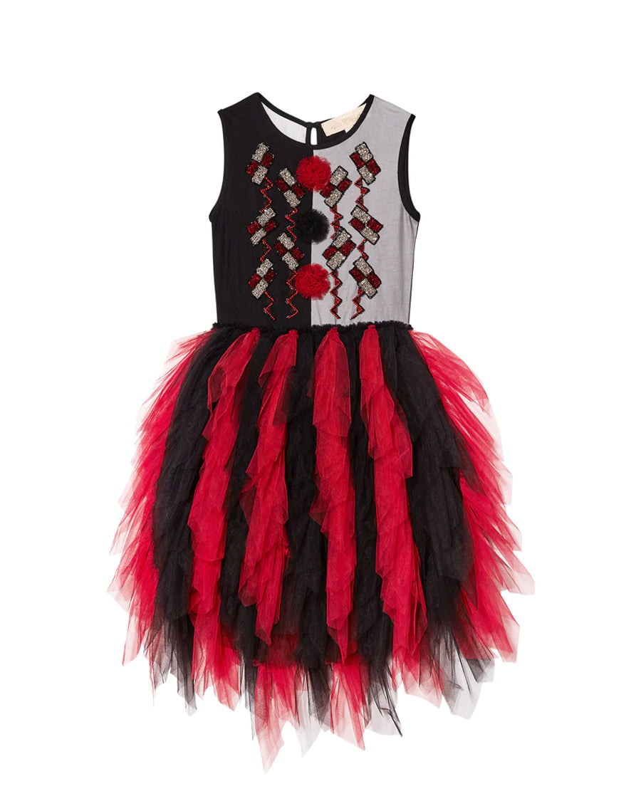 I scream, you scream, we all scream for...the Halloween Hello Scream Tutu Dress costume! Featuring a dramatic silhouette created by the alternating coloured tulle skirt which cascades in dramatic layers of finest blood red and black tulle. A shimmering checkerboard-like motif takes centre stage and added tulle pom poms decorate the bodice for extra drama! There is a button and loop fastening is featured at the neck for added comfort. The perfect costume for this upcoming spooky season. Made by Tutu du Monde.