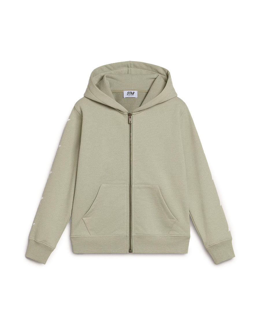 A collection with a casual soul but a versatile attitude: inspired by the Seventies, it has a timeless vintage appeal, suited to any occasion or look. This regular-fit, light green cotton hooded sweatshirt with a zip closure features white stars on the sleeves.