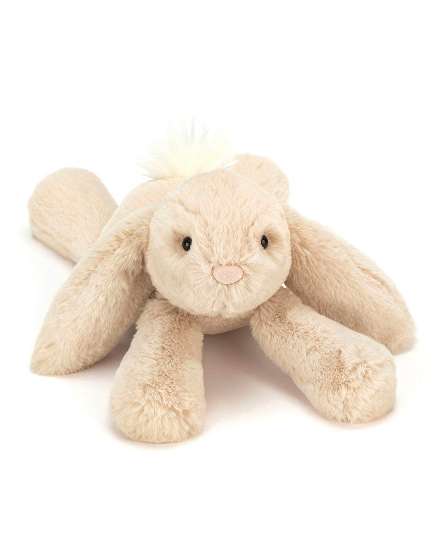 Smudge Rabbit is such a sleepy sweetie - always sprawling out, lazing on the bed or rug! Scrumptiously soft in oatmeal fur, this lop-eared lazer just captures the heart. An incredibly lopsy and loving companion, Smudge is a great gift for any bouncing baby. Bonnets and bobtails - we like it!