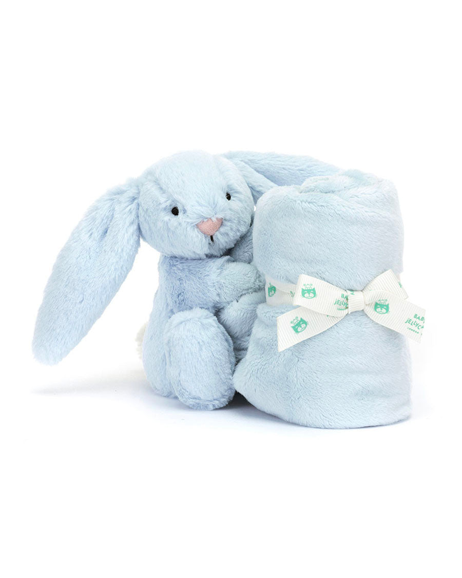 Bashful Blue Bunny Soother is our most loved Bashful Bunny in a soft fur, with long lopped ears, a pink suedette nose and stitched eye detail holding a square shaped soother, un-stuffed and irresistibly soft to touch. Choose from a selection of fonts and thread colors to personalize the blanket and create an extra special gift.