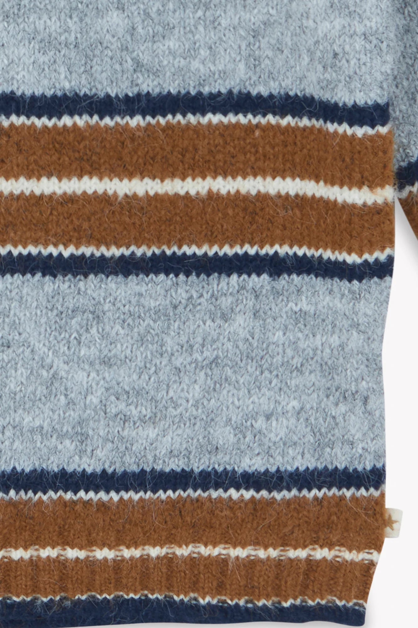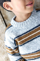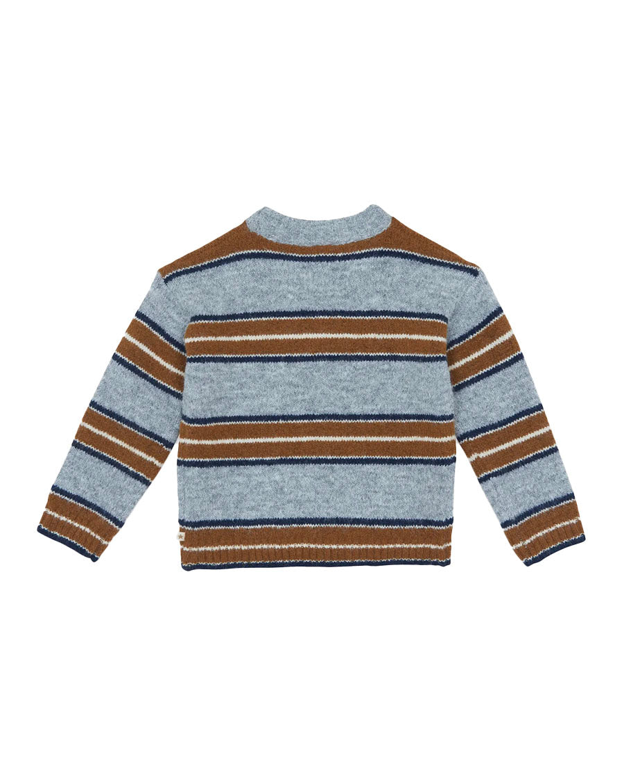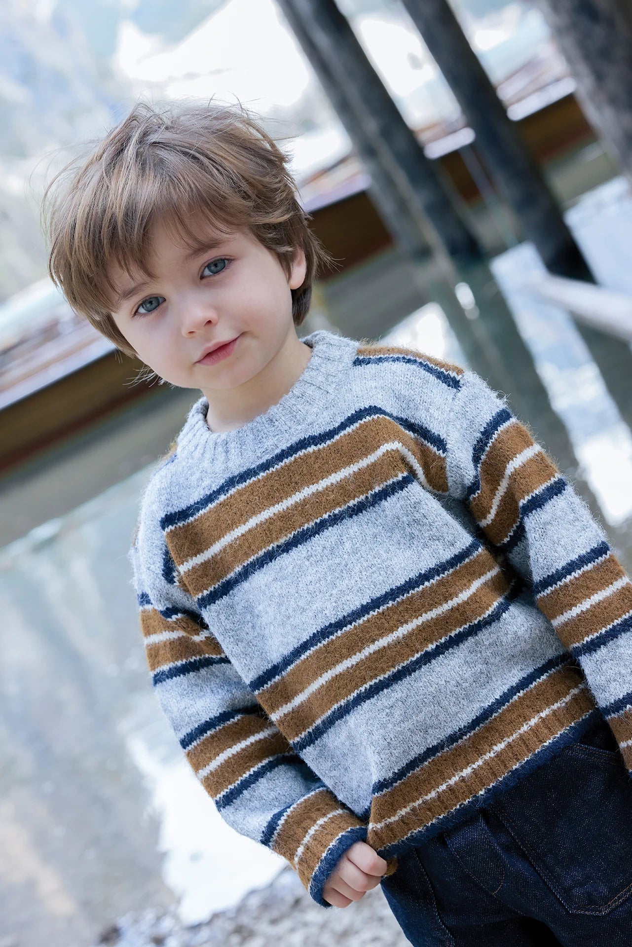 Discover the Sweater Milton with stripes, an essential room in the "New Barn" collection! Perfect for young adventurers, with its brown, white and black stripes on a background Grey China. Inspired by Cowboy style, this Sweater combines comfort and rustic charm. Ideal for a day at the Ranch or a relaxed outing, it goes perfectly with jeans or a Trousers in Velvet For a western look Kid style !