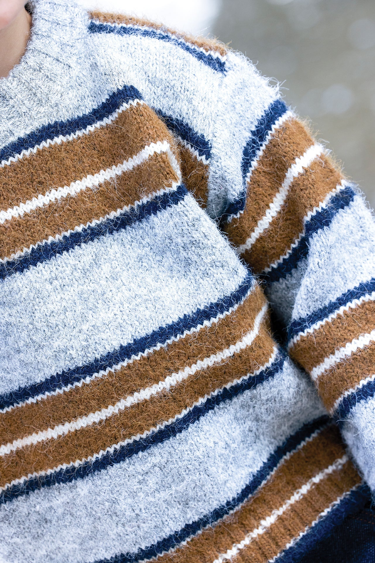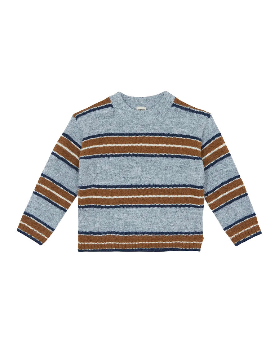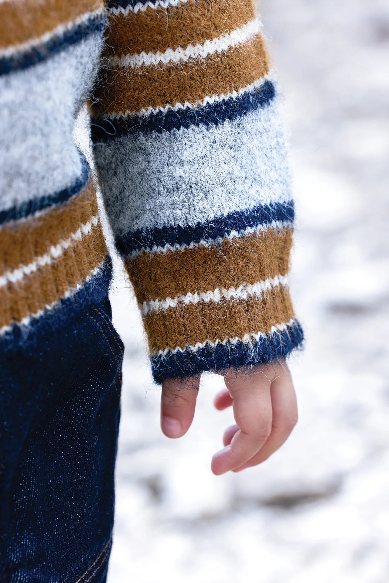 Discover the Sweater Milton with stripes, an essential room in the "New Barn" collection! Perfect for young adventurers, with its brown, white and black stripes on a background Grey China. Inspired by Cowboy style, this Sweater combines comfort and rustic charm. Ideal for a day at the Ranch or a relaxed outing, it goes perfectly with jeans or a Trousers in Velvet For a western look Kid style !