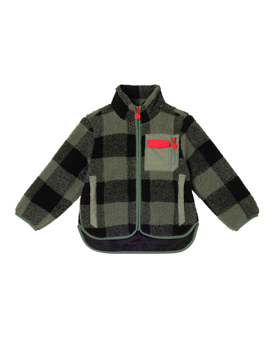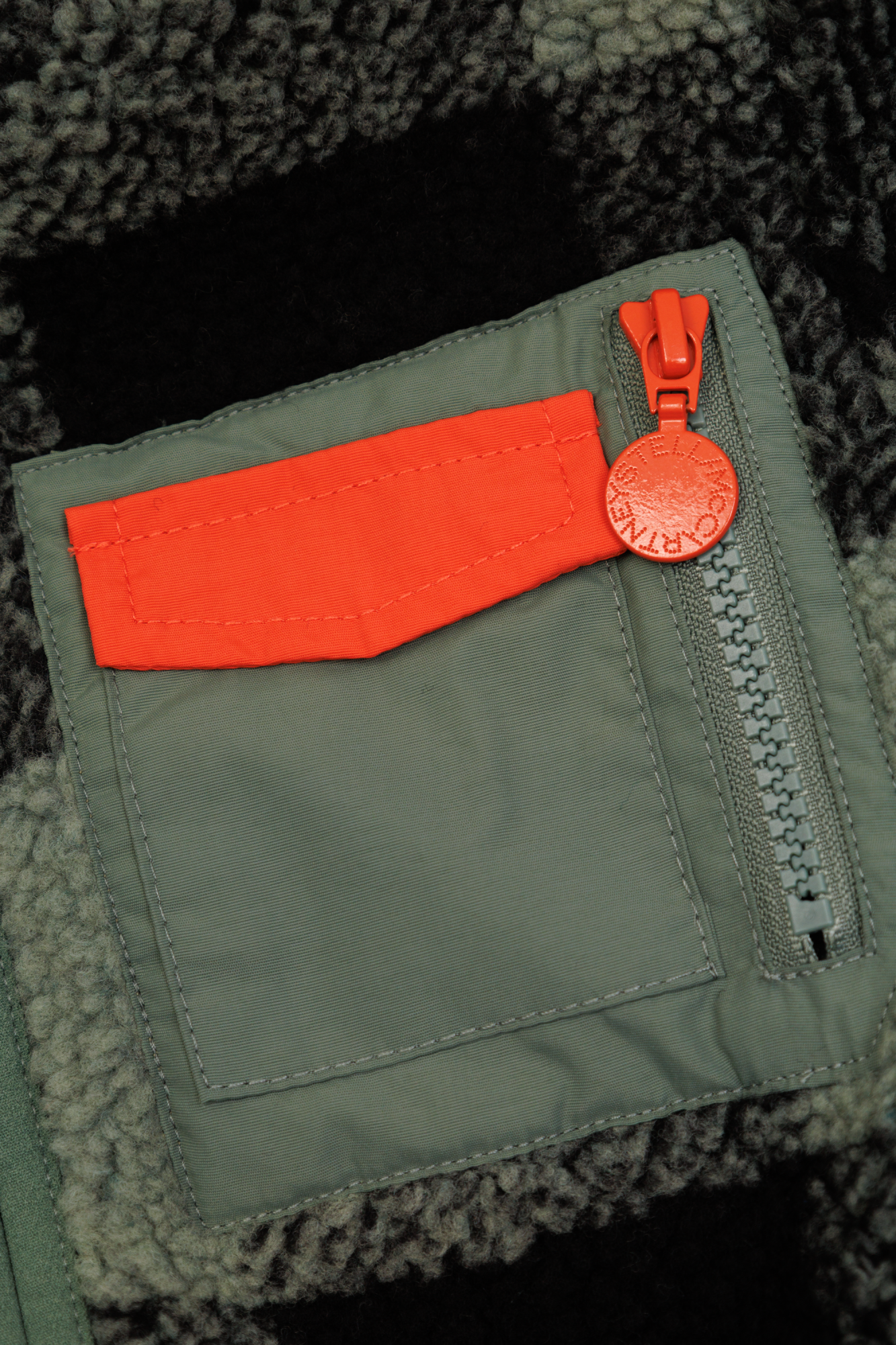 The bold oversized plaid, rendered in deep shades of green and black, introduces a playful yet sophisticated charm. A standout chest pocket, adorned with a vibrant orange flap and zip closure, showcases the brand’s embossed logo—an exclusive mark of its distinguished design lineage. The vertical front zipper gracefully echoes the jacket’s clean, practical aesthetics.