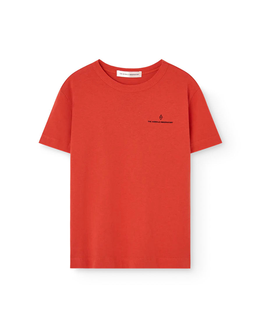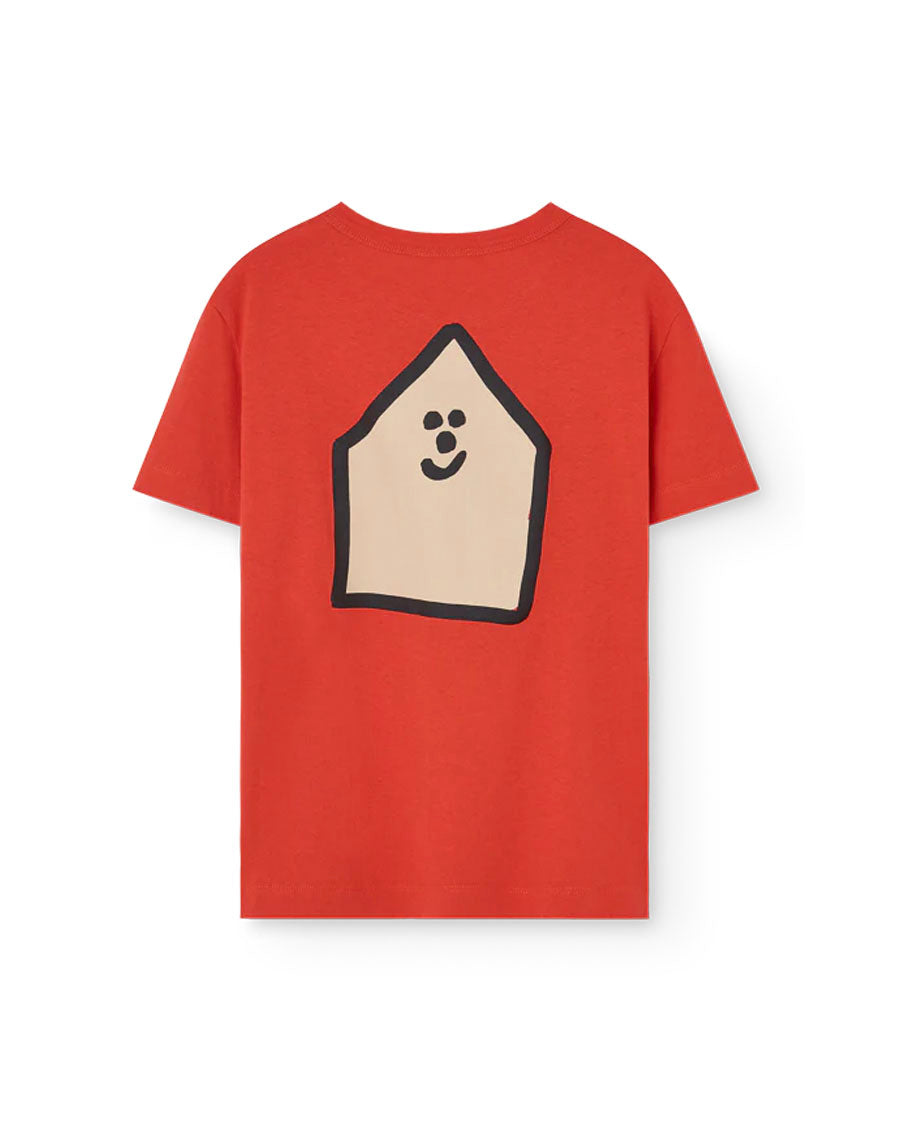 A red t-shirt with a minimal chest logo and a friendly house graphic on the back, designed for elegant kid clothes with a playful twist.