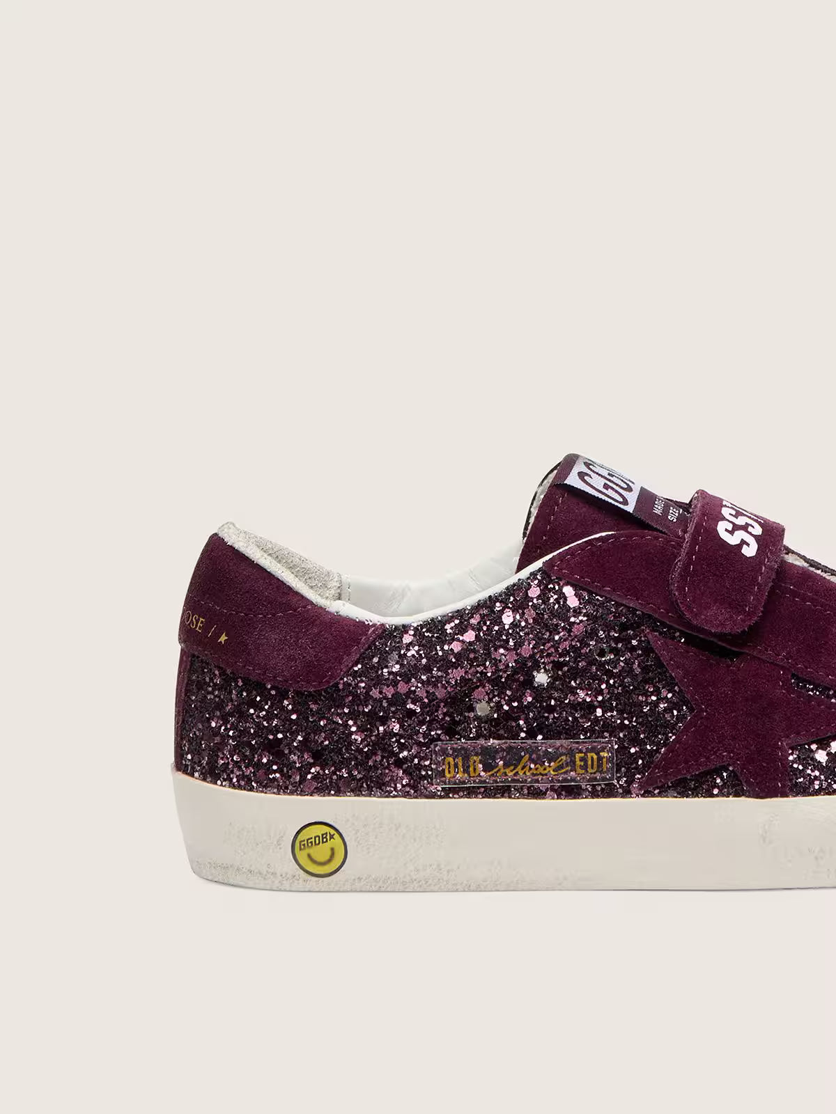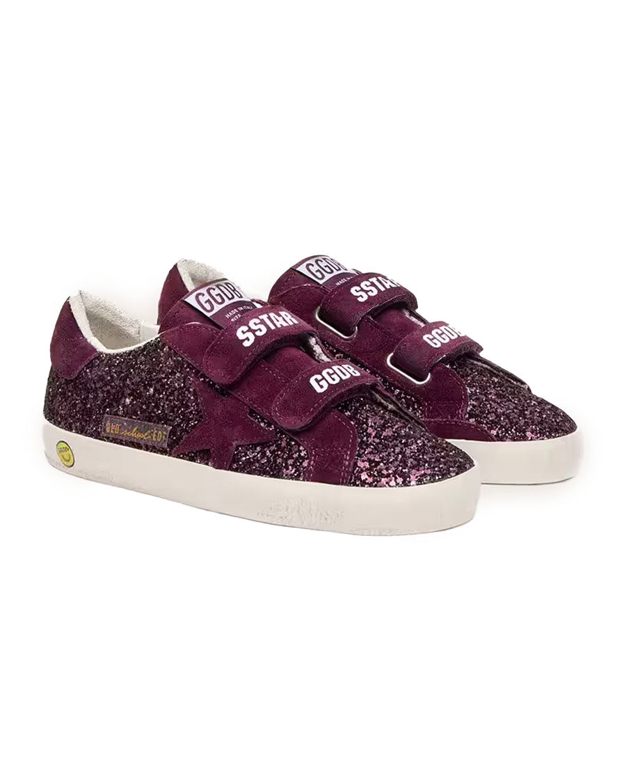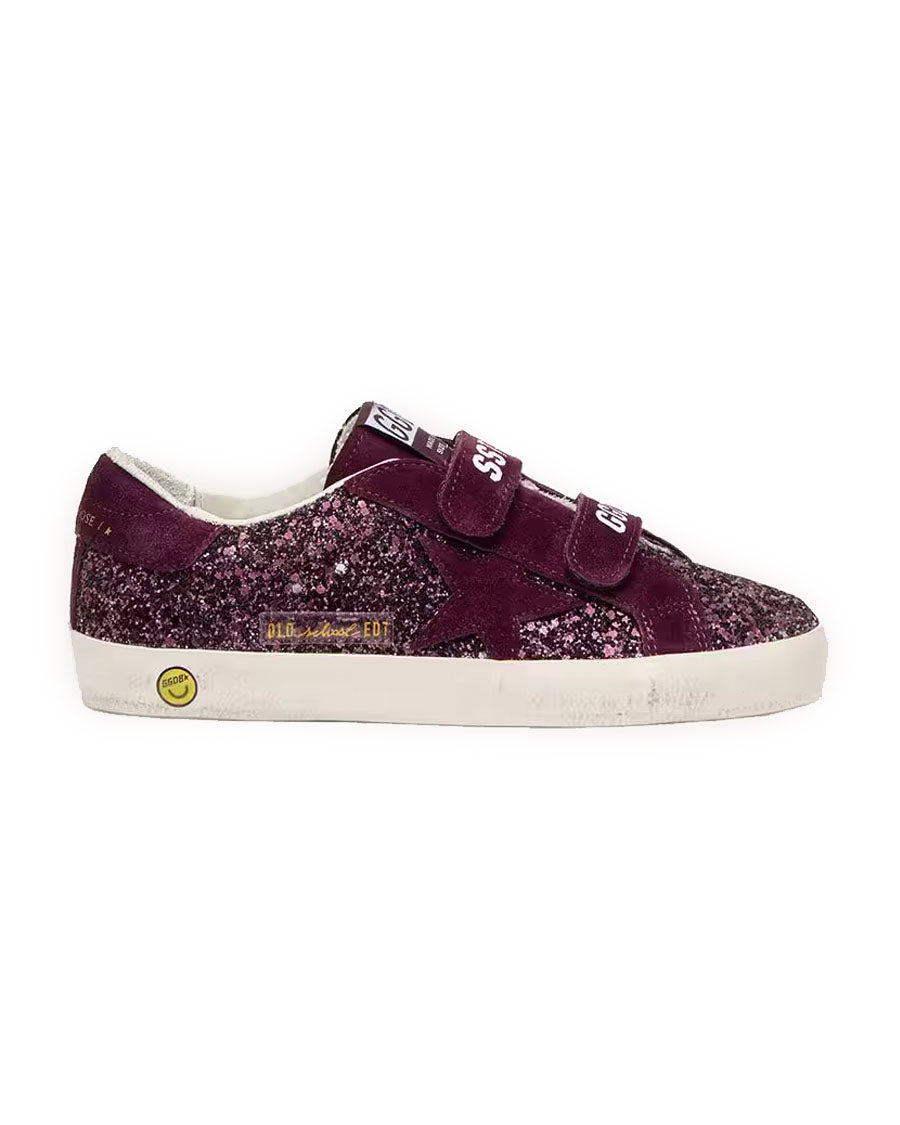 Our Old School sneakers feature two Velcro straps on the front with contrasting logo. With a burgundy glitter upper, the Junior version of this model features a burgundy suede star and heel tab. The contrasting smiley detail on the foxing completes the look.