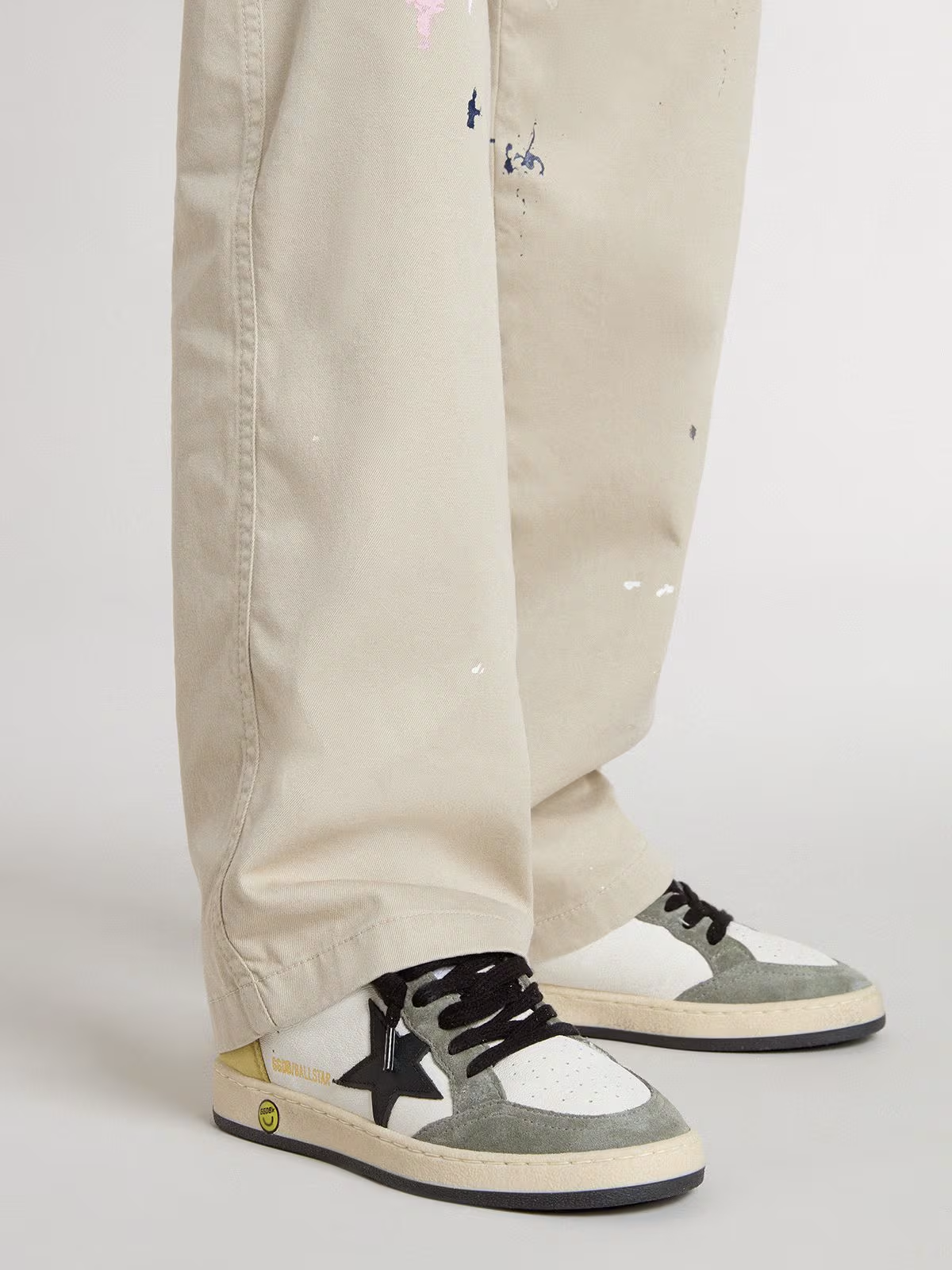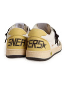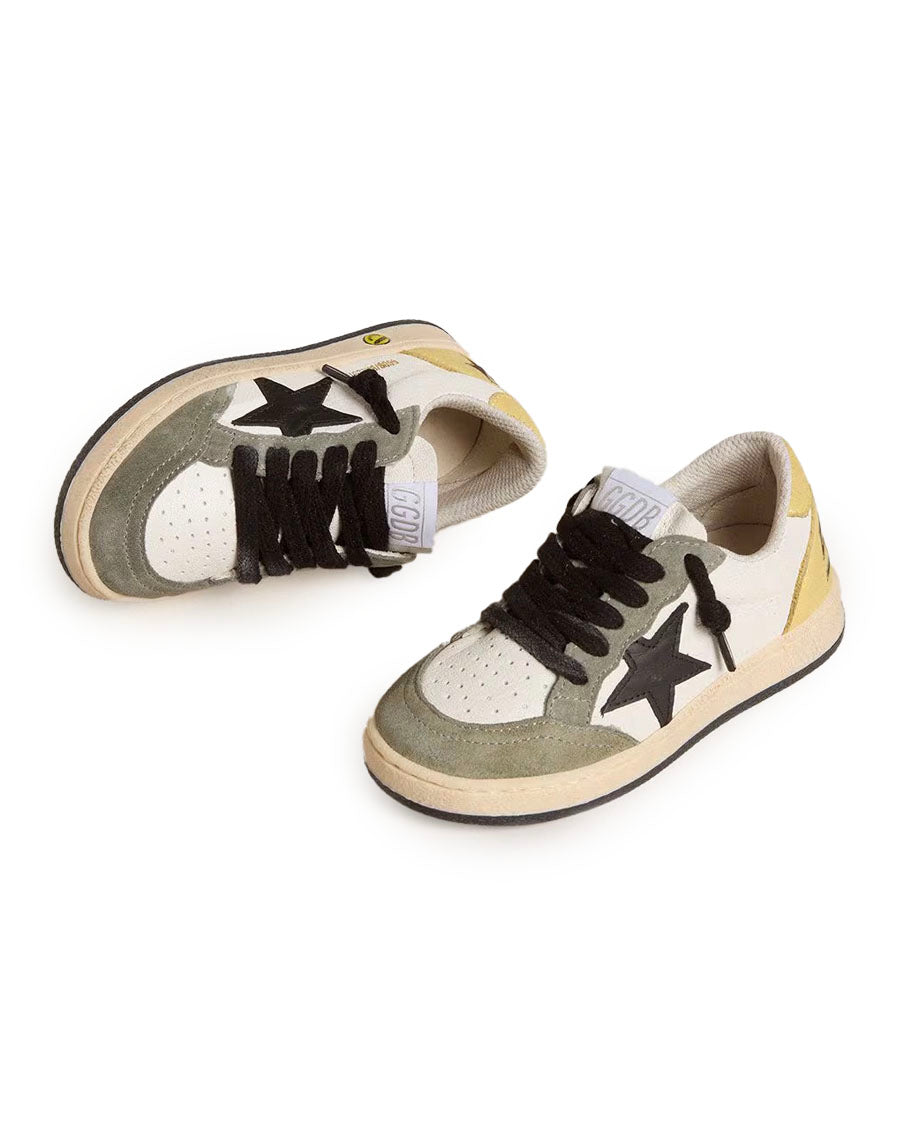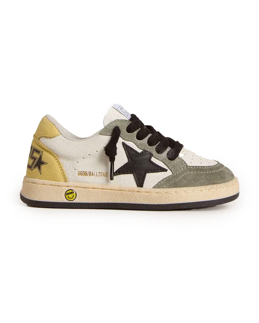 Dreaming of the Eighties. Our Ball Star sneakers have an American college vibe caught between a hoop shot and a skateboard ride. With a white nappa leather upper, the Junior version of this model features a black leather star, yellow nubuck heel tab and dark green suede inserts. The yellow nubuck insert on the back, the smiley on the foxing, and the black laces add the finishing touch: beautiful things that never go out of fashion.
