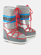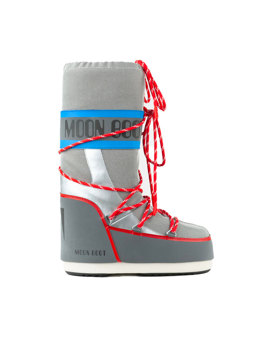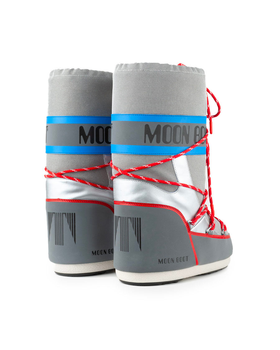 Lace up for liftoff: the Icon Space Racing boots bring interstellar style to the streets in this striking silver, red and blue colorway. Featuring all the hallmarks of the original – padded insulation, lightweight mid soles and suction pads for serious ground control – the voluminous knee-high silhouette delivers warmth, comfort and fearless flair, one bold step at a time.