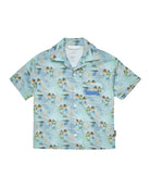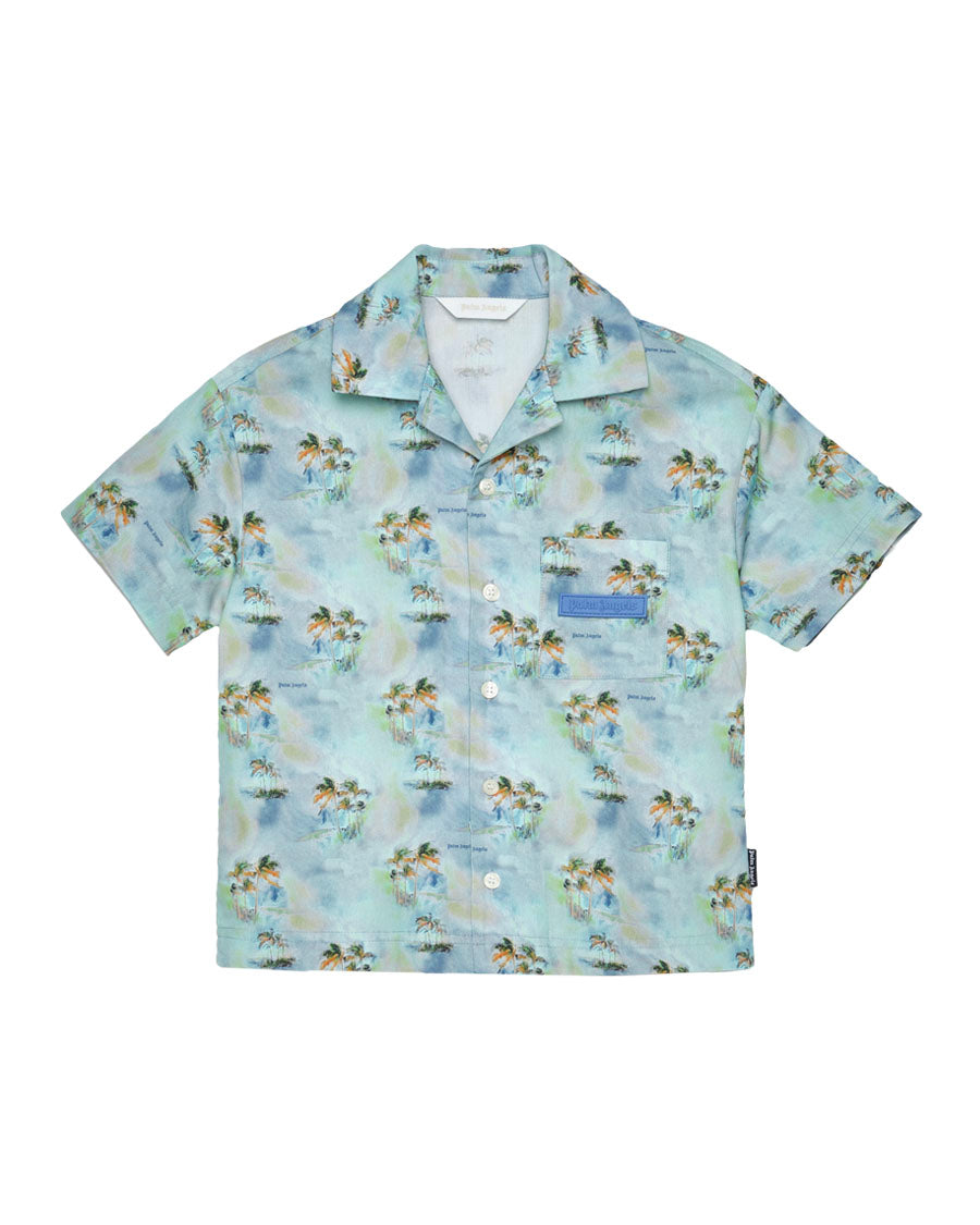 Boy's baby blue bowling shirt with short sleeves and all over digital print of palm trees and dusty blue silicone patch with embossed logo on the front.