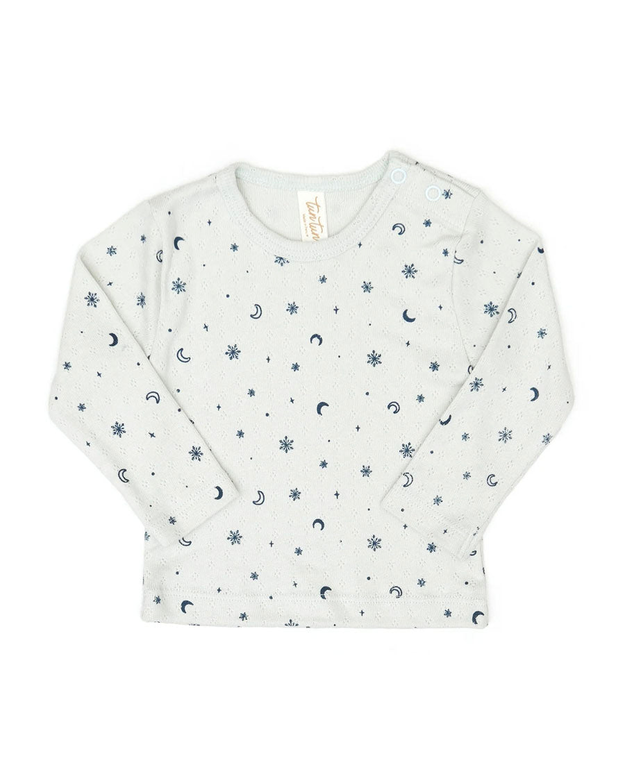 Cotton top with a delicate snowflakes print, crafted from 100% cotton, known for its softness and durability. The charming design and soft tones make it a perfect choice for any occasion.
