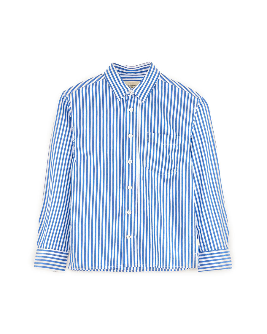 Oversized shirt with a classic collar, long sleeves with buttoned cuffs and a straight hem, made from white cotton poplin with blue stripes.