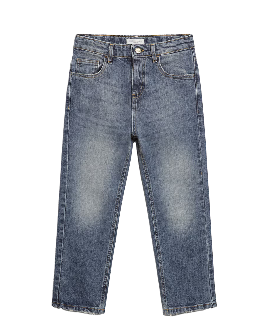 These medium-wash denim jeans feature a regular fit, stretch fabric and a slightly wide leg. The five pockets add