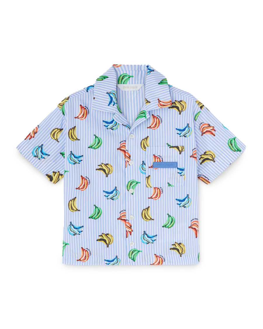Wearing SS25 bananas pop print is pure fun. Boy's vertical striped bowling shirt with all over print of multicolored bananas and blue silicone patch with embossed logo.