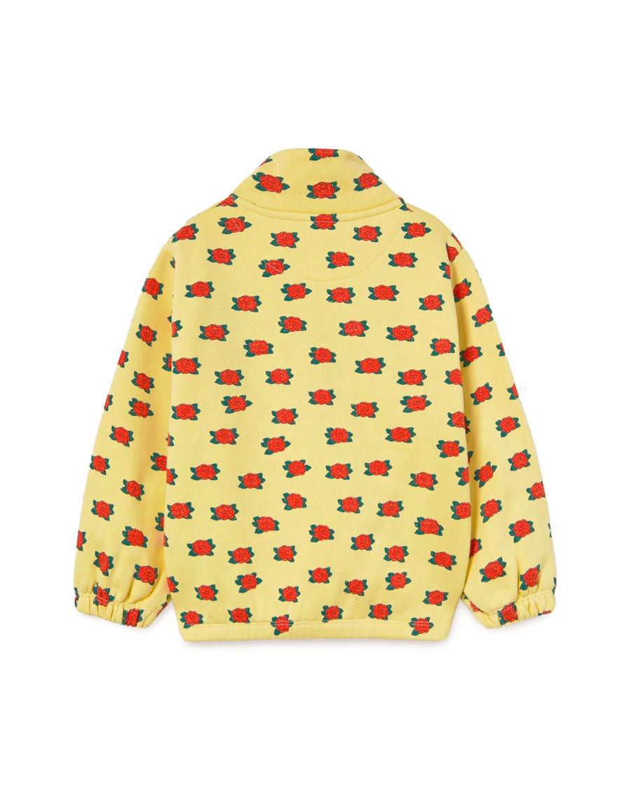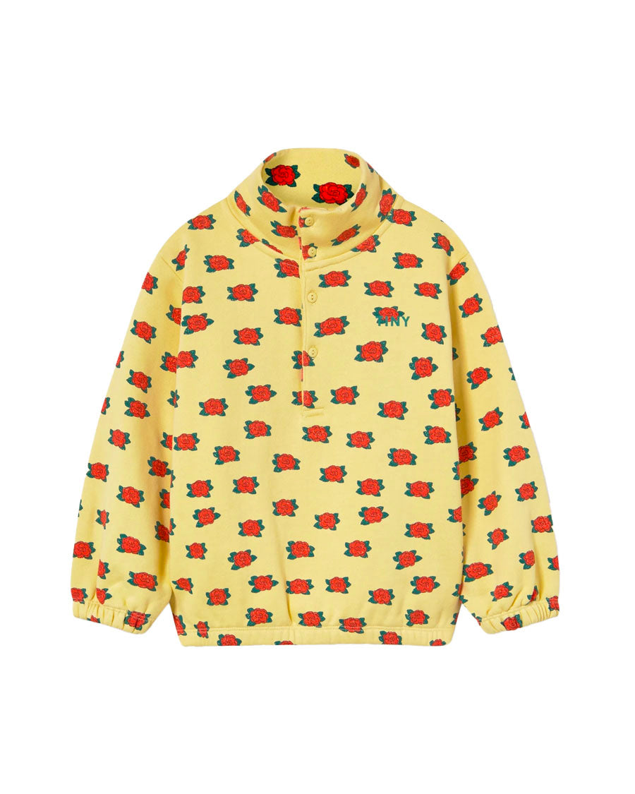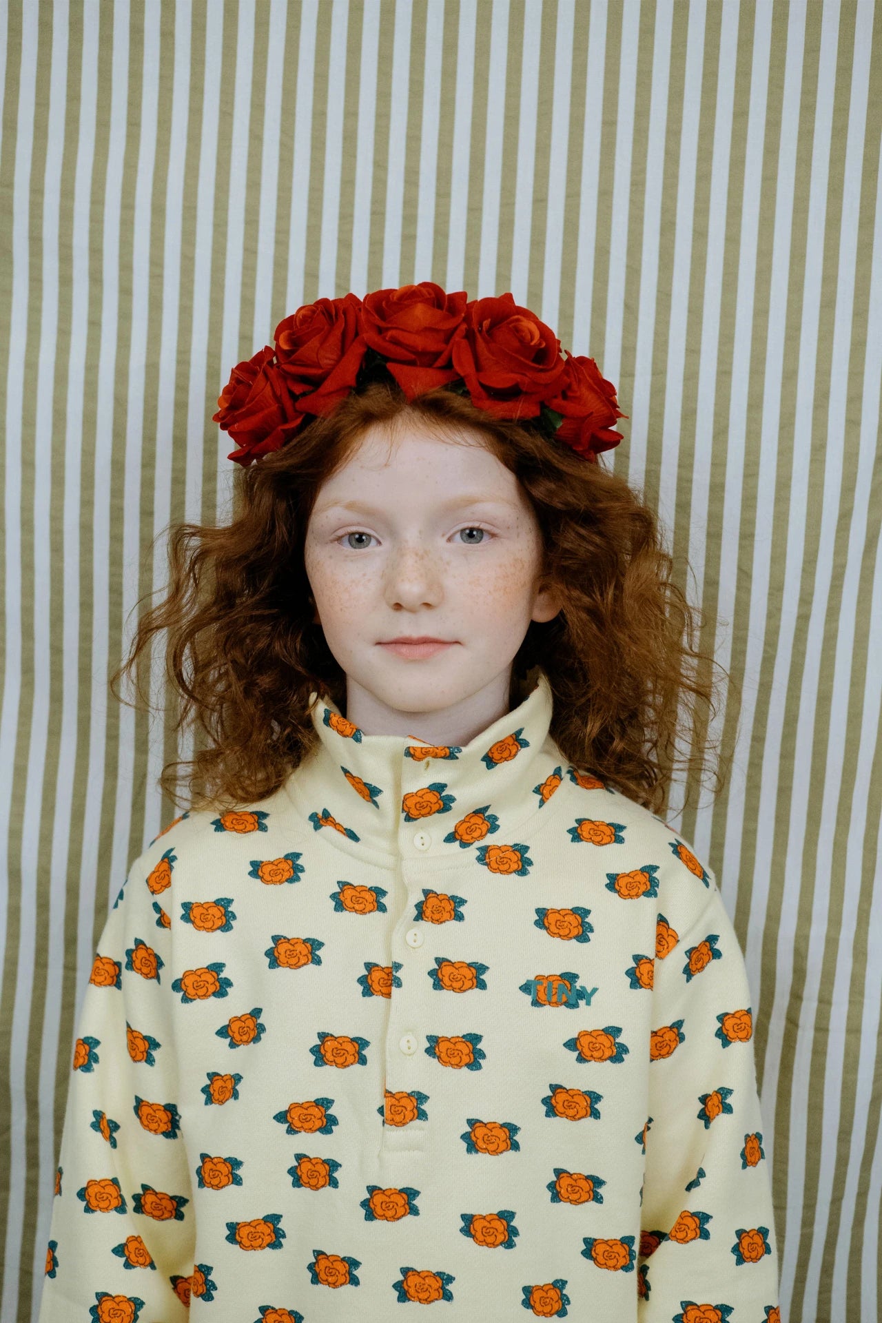This Camelias printed sweatshirt is crafted from 100% organic cotton. It features a comfortable mockneck silhouette with elasticated hems and a half-front button opening. Perfect for casual outings or cozy days at home, this sweatshirt combines style and comfort with a focus on quality.