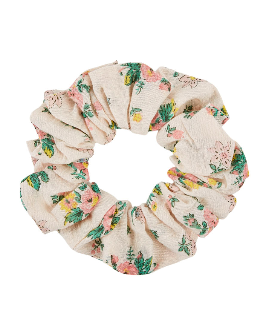 Powder-beige cotton scrunchy dotted with bouquets of flowers. Wear it in your hair or as a bracelet around your wrist, this scrunchie goes perfectly with the dress or blouse we offer in the same print.