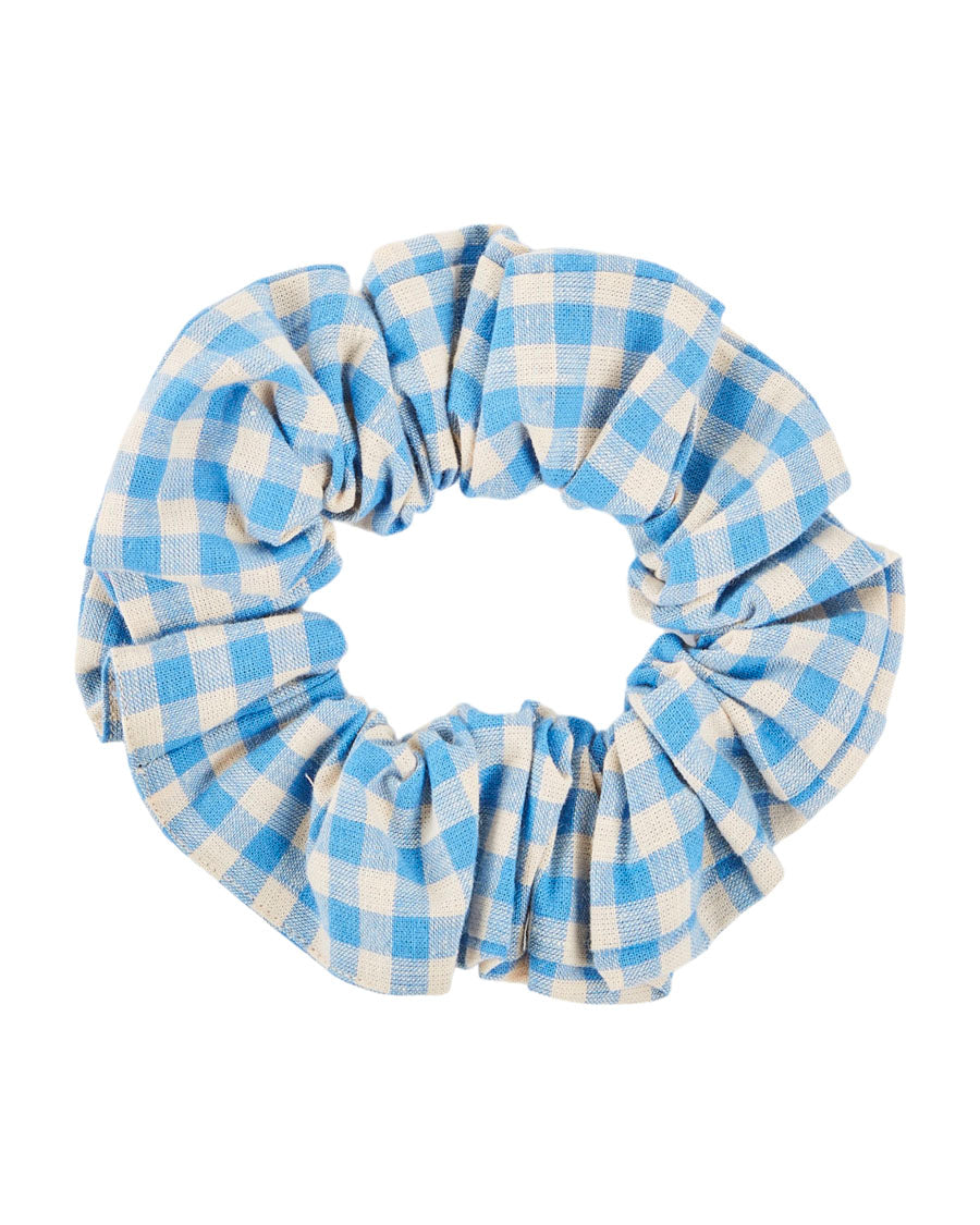 Off-white and blue gingham cotton scrunchy. Wear it in your hair or as a bracelet around your wrist, this scrunchie goes perfectly with the dress or blouse we offer in the same print.