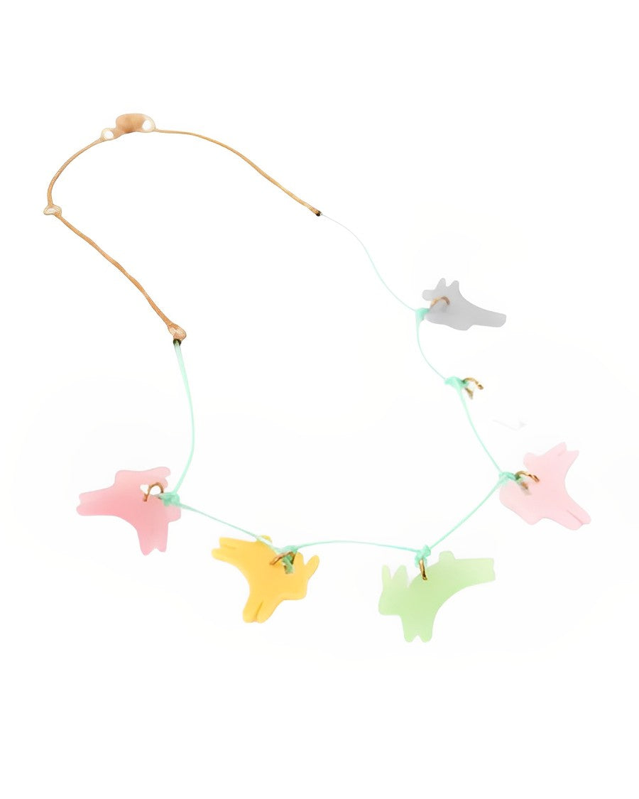 This bunny necklace is a wonderful accessory to wear to Easter, or springtime, parties. The bunnies are crafted from acrylic, with a gold tone chain and mint cord necklace. Made by Meri Meri.