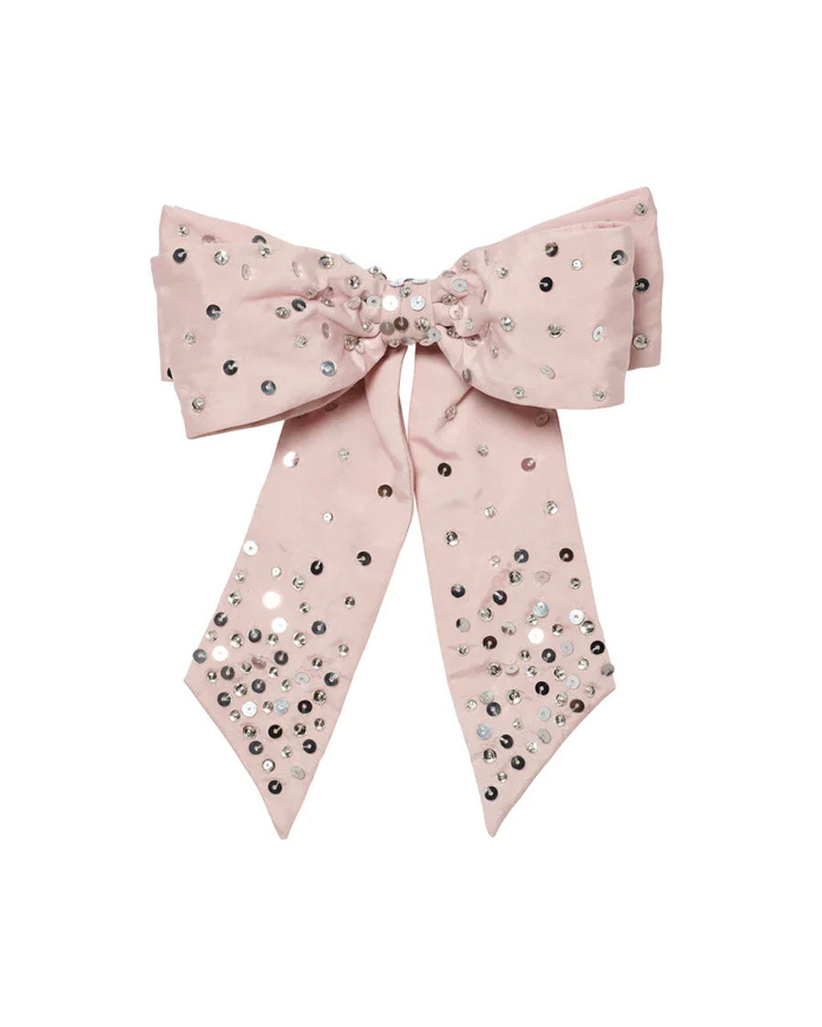 Introducing the All that Glitter Hairclip in Heavenly Pink, featuring an oversized pink bow fixed to a metal clip. Adorned with a scatter of sequins, this accessory adds a touch of elegance and charm to any hairstyle.