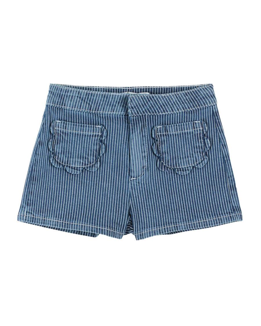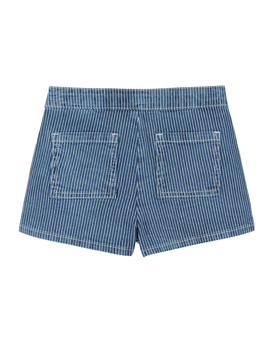 Blue stretch denim cotton canvas shorts with fine white stripes.